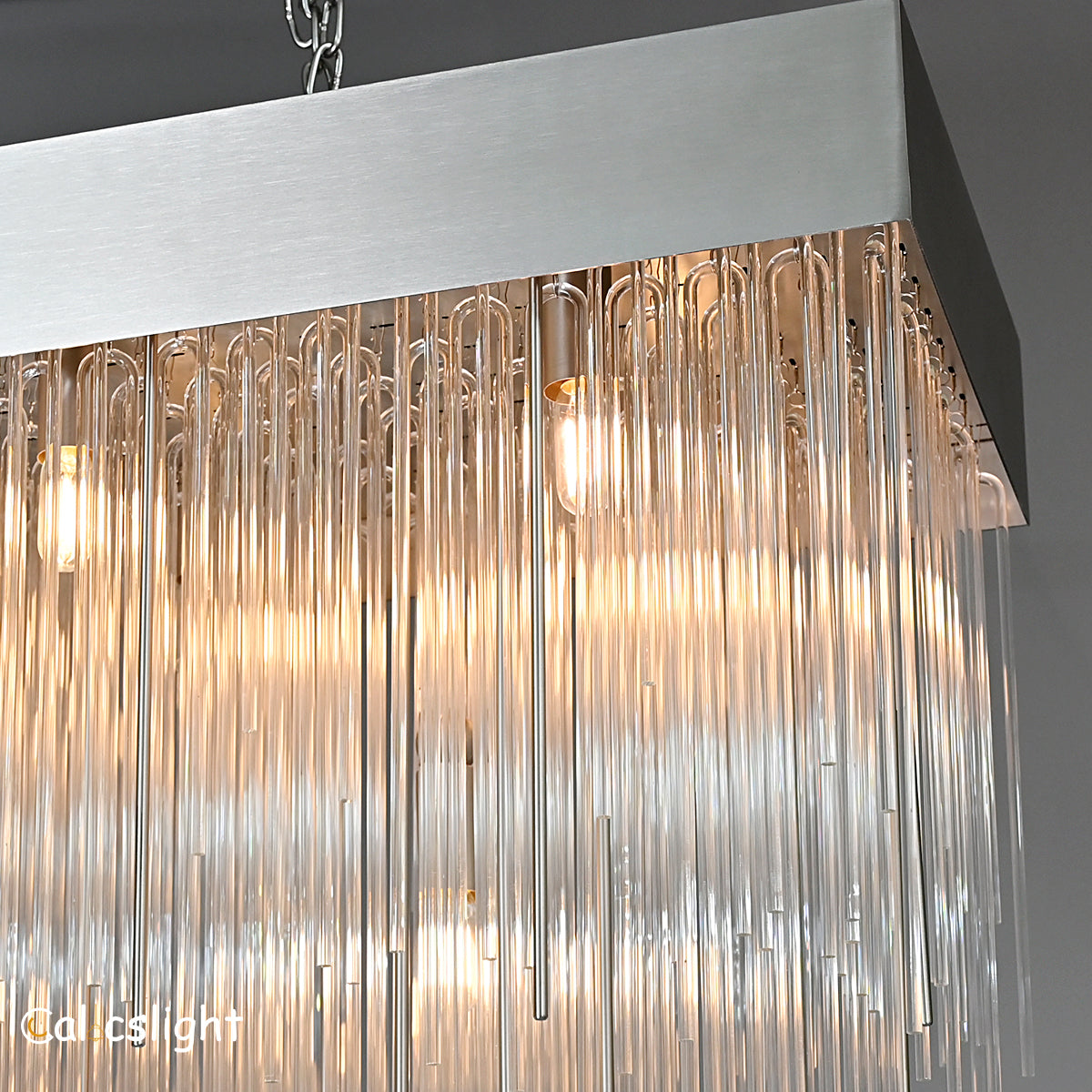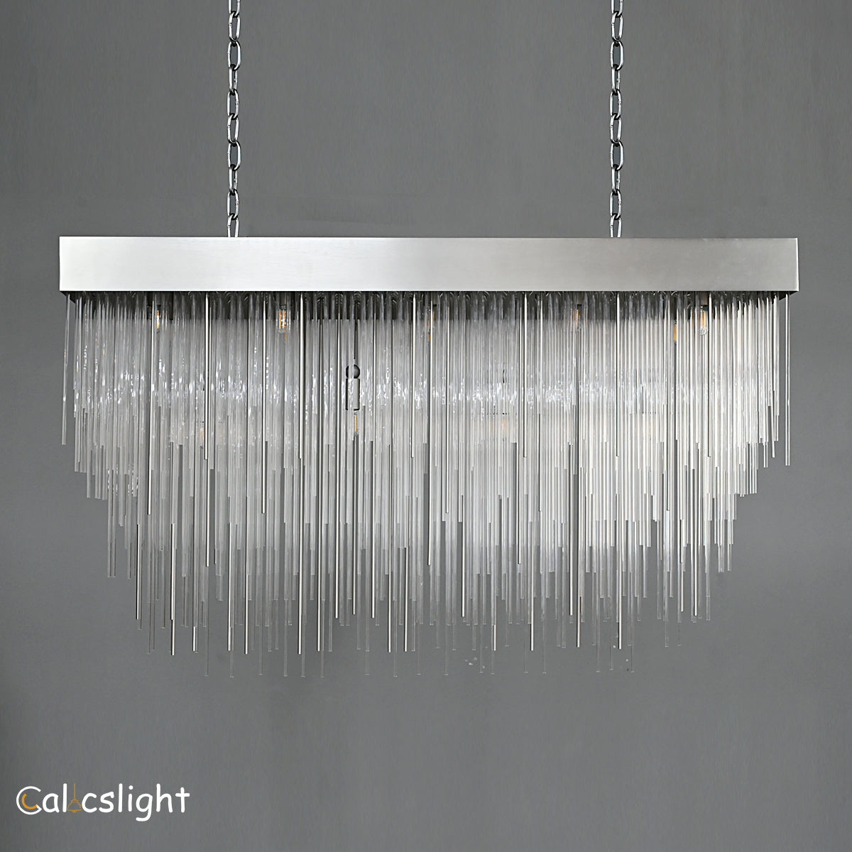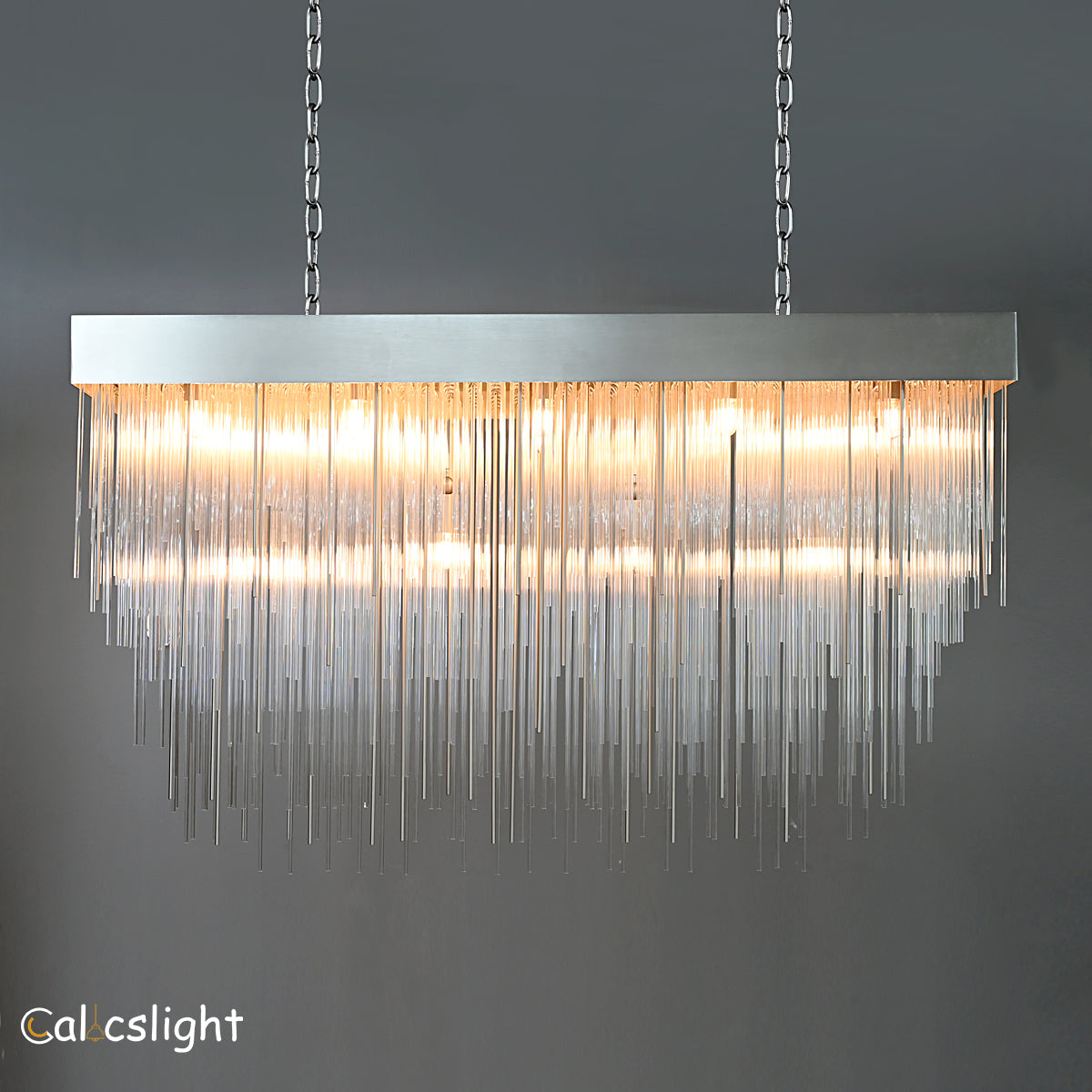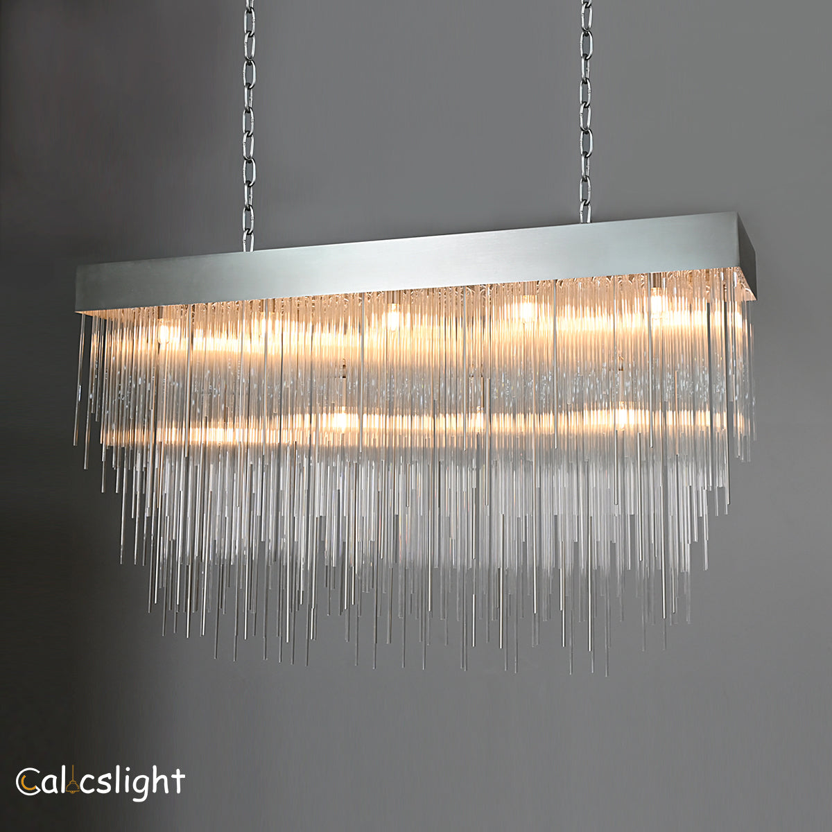 Ascade of crystal and metal rods coexist in this dazzling display of light. Artfully evoking rainfall frozen in time, hundreds of slender tubes are suspended asymmetrically from a sleek canopy, casting a refractive glow to dramatic effect.
