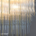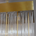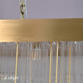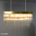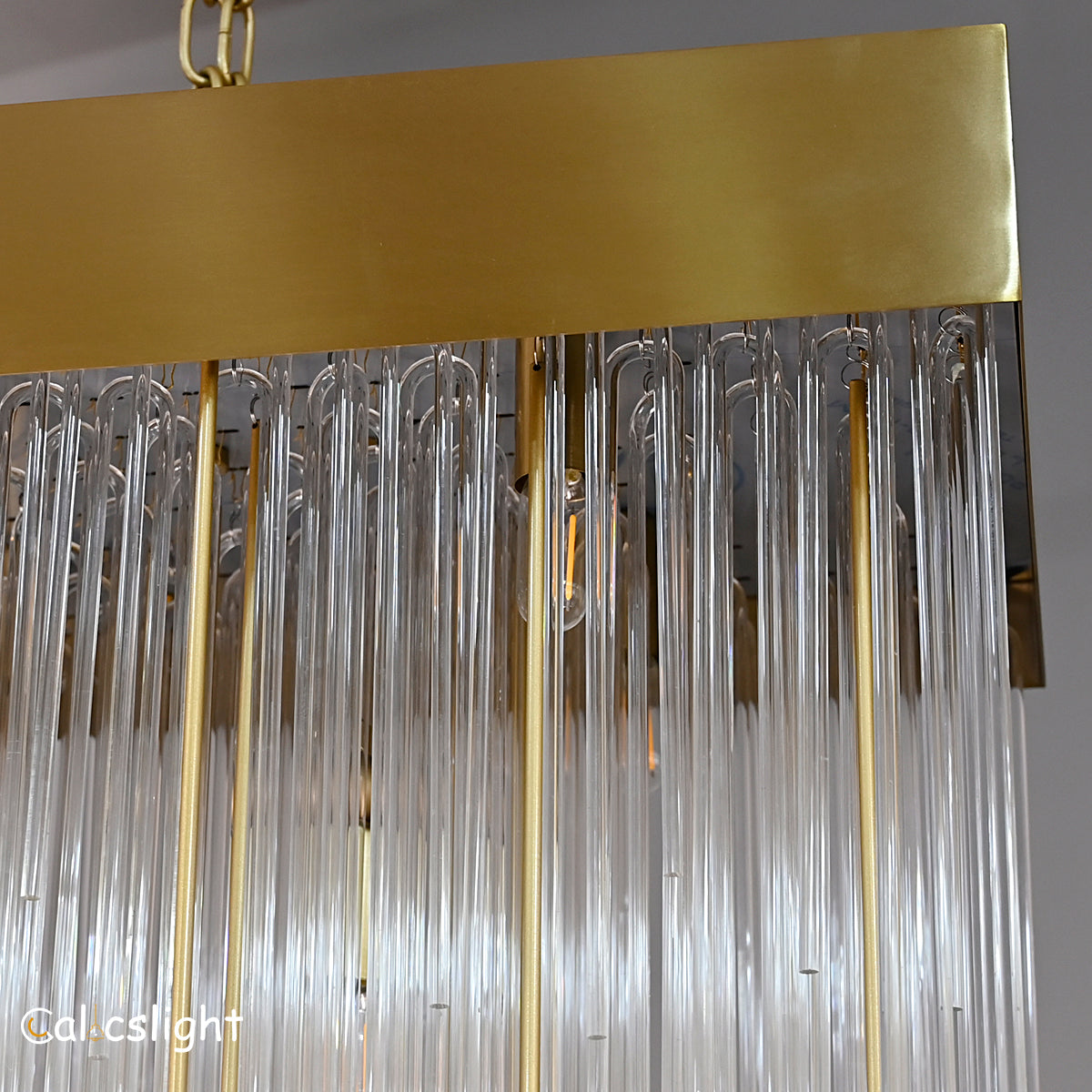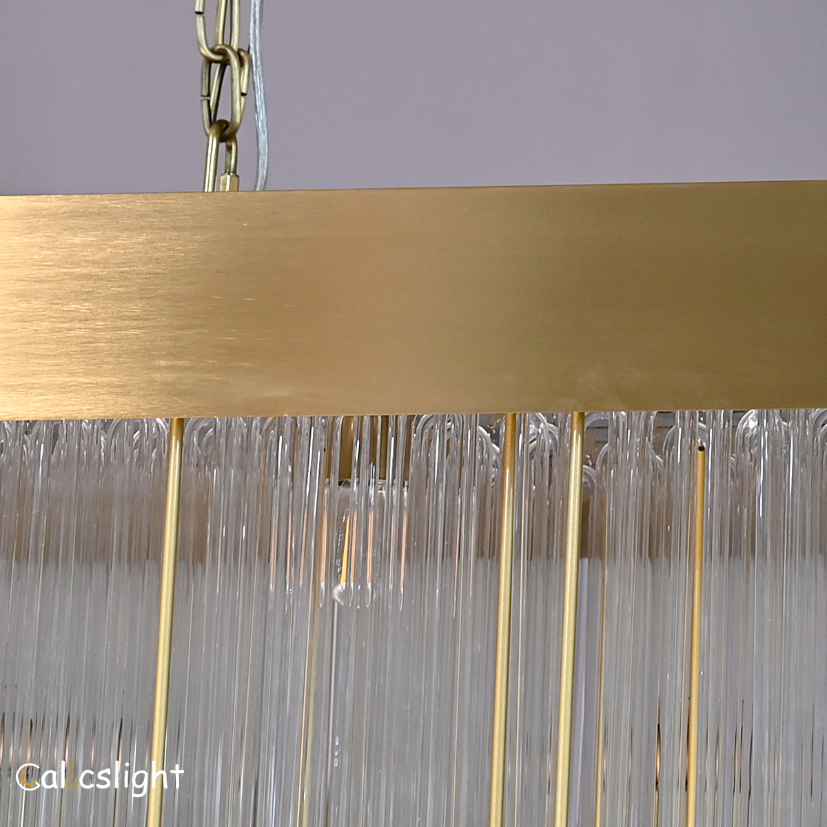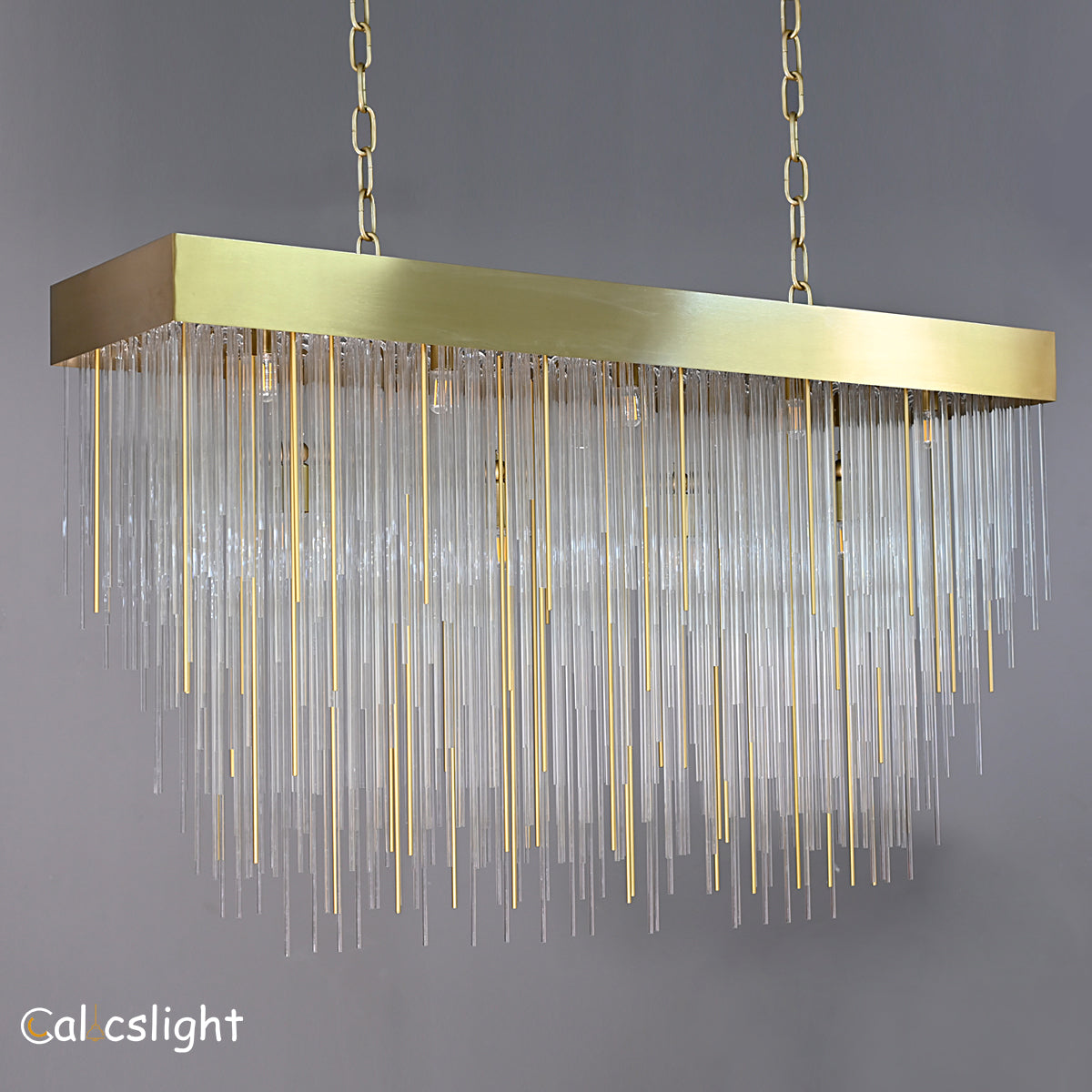 Ascade of crystal and metal rods coexist in this dazzling display of light. Artfully evoking rainfall frozen in time, hundreds of slender tubes are suspended asymmetrically from a sleek canopy, casting a refractive glow to dramatic effect.