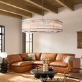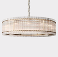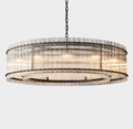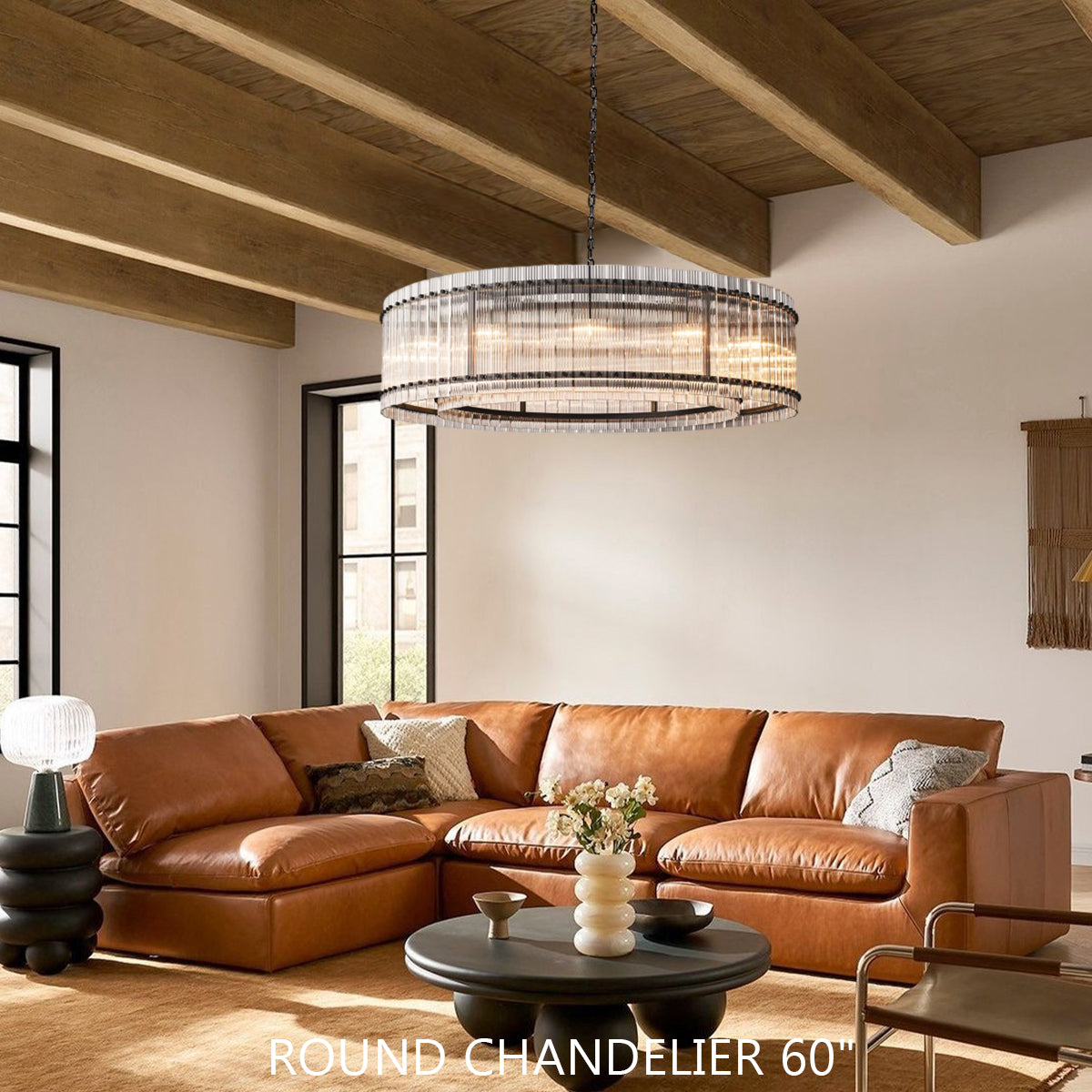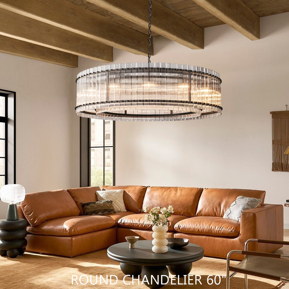 A grand expression of refined design, this chandelier features dozens of hand-raked glass panes arranged around a wide circular metal frame. The fluted glass texture catches and diffuses the light, creating a soft, glowing ambiance with dimensional depth. At 60" in diameter, it makes a striking focal point for double-height spaces, great rooms, or formal dining areas.