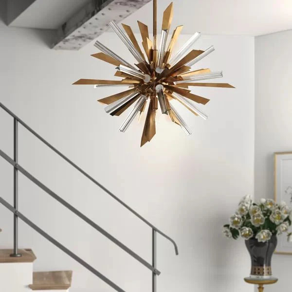 The Mandoza Brass Glass Chandelier is a striking fusion of elegance and modern design. Featuring...