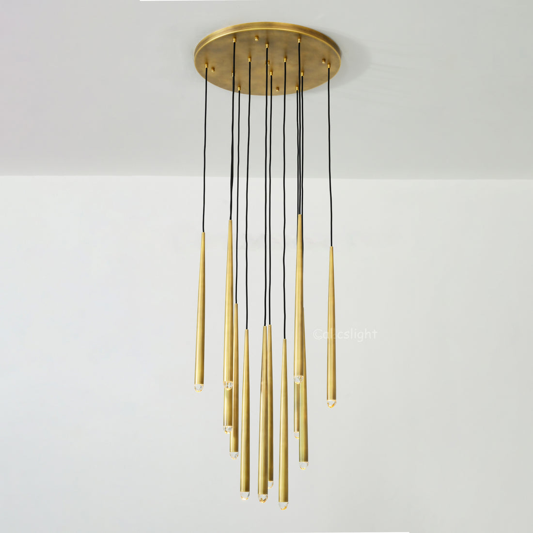 This elegant chandelier features a cluster of tapered solid brass pendants suspended from a round...
