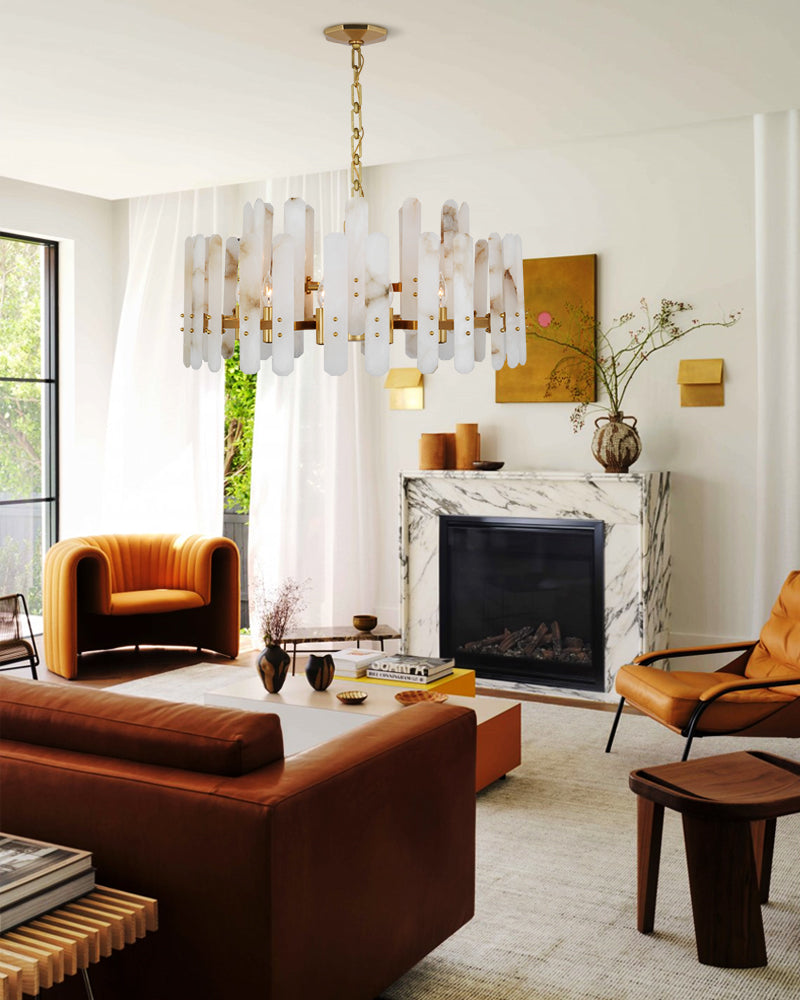 Illuminate your decor with the Chandelier, where antique black meets the celestial beauty of alabaster...