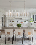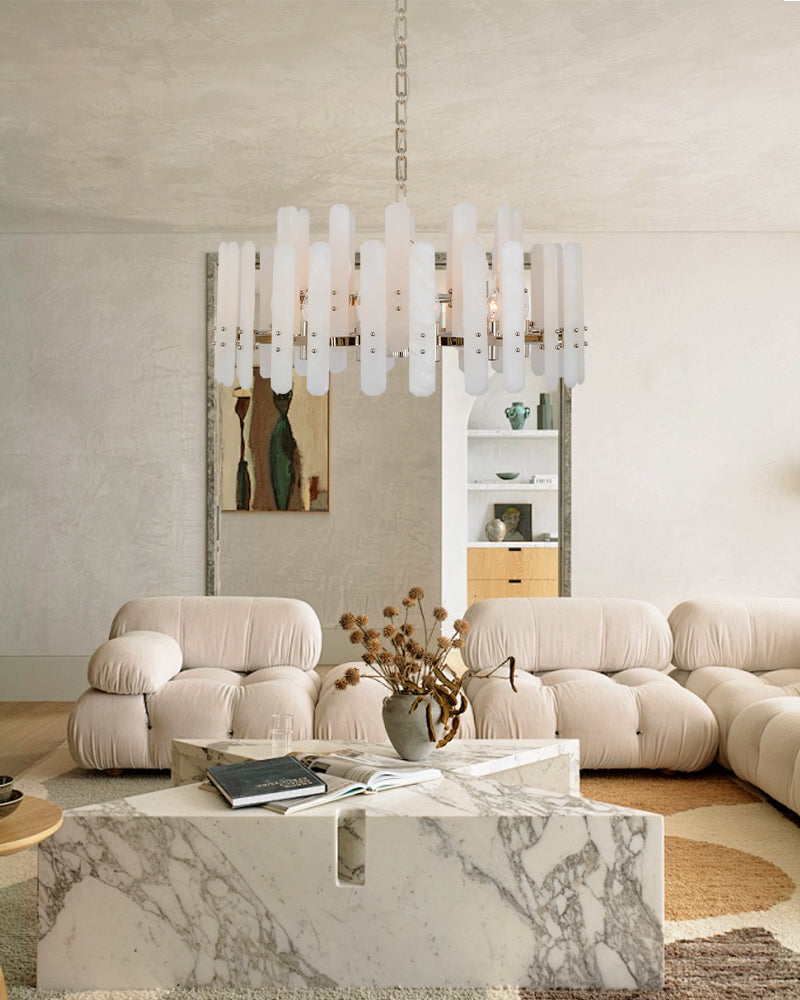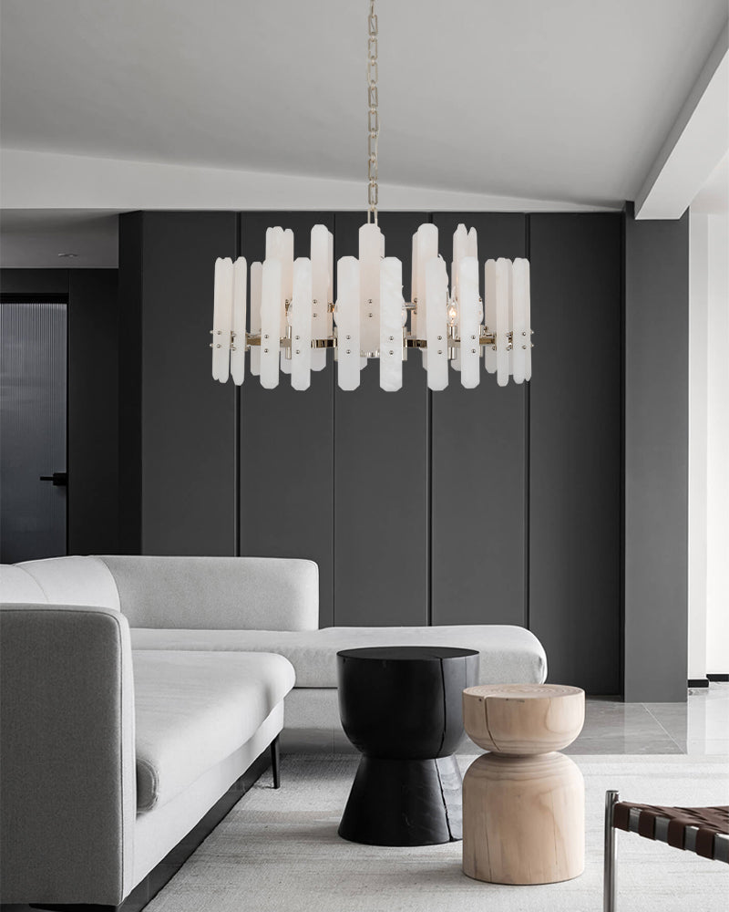 The material of alabaster is marble and copper. Elevate your space with this elegantly crafted chandelier, blending minimalist modern design with timeless sophistication. Perfect for living rooms, dining areas, or entryways, it harmonizes functionality and artistry.