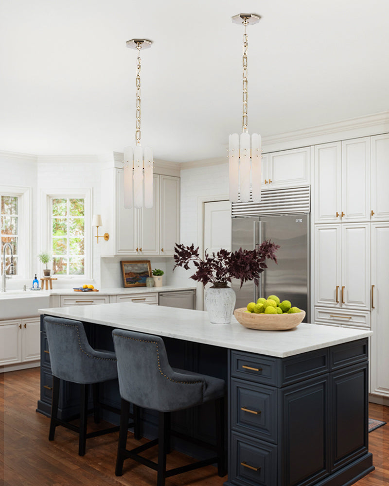- Durable alabaster diffuses light; brushed metal adds refined contrast.
