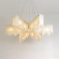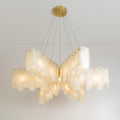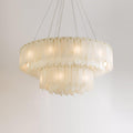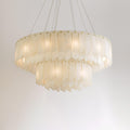 The Alabaster Cascade Tiered Chandelier is a magnificent display of artisanal craftsmanship and opulent design. Gracefully suspended from a brass canopy, this chandelier features layers of sumptuous alabaster panels that descend in a tiered fashion, creating a breathtaking cascade of warm light.