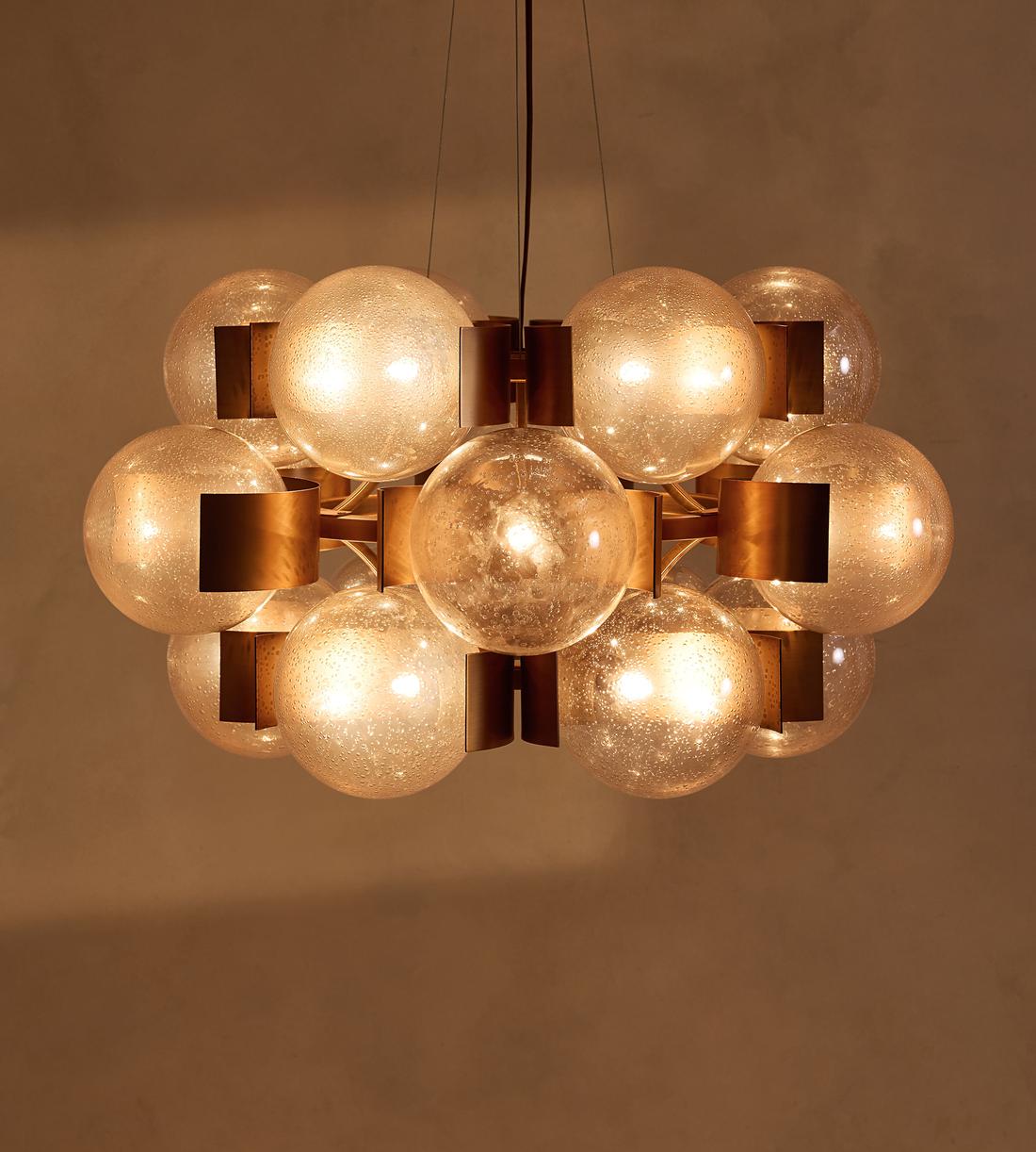 The Allis chandelier is our take on mid-century style pendants seen in White City House. Eighteen champagne tinted glass globes have bubbles throughout the glass to cast shadows and add texture to your lighting scheme. Sitting on antique brass finish arms each with a matching brass surround, the adjustable height means you can hang high or low above your dining table for a talking point centrepiece.