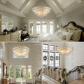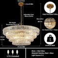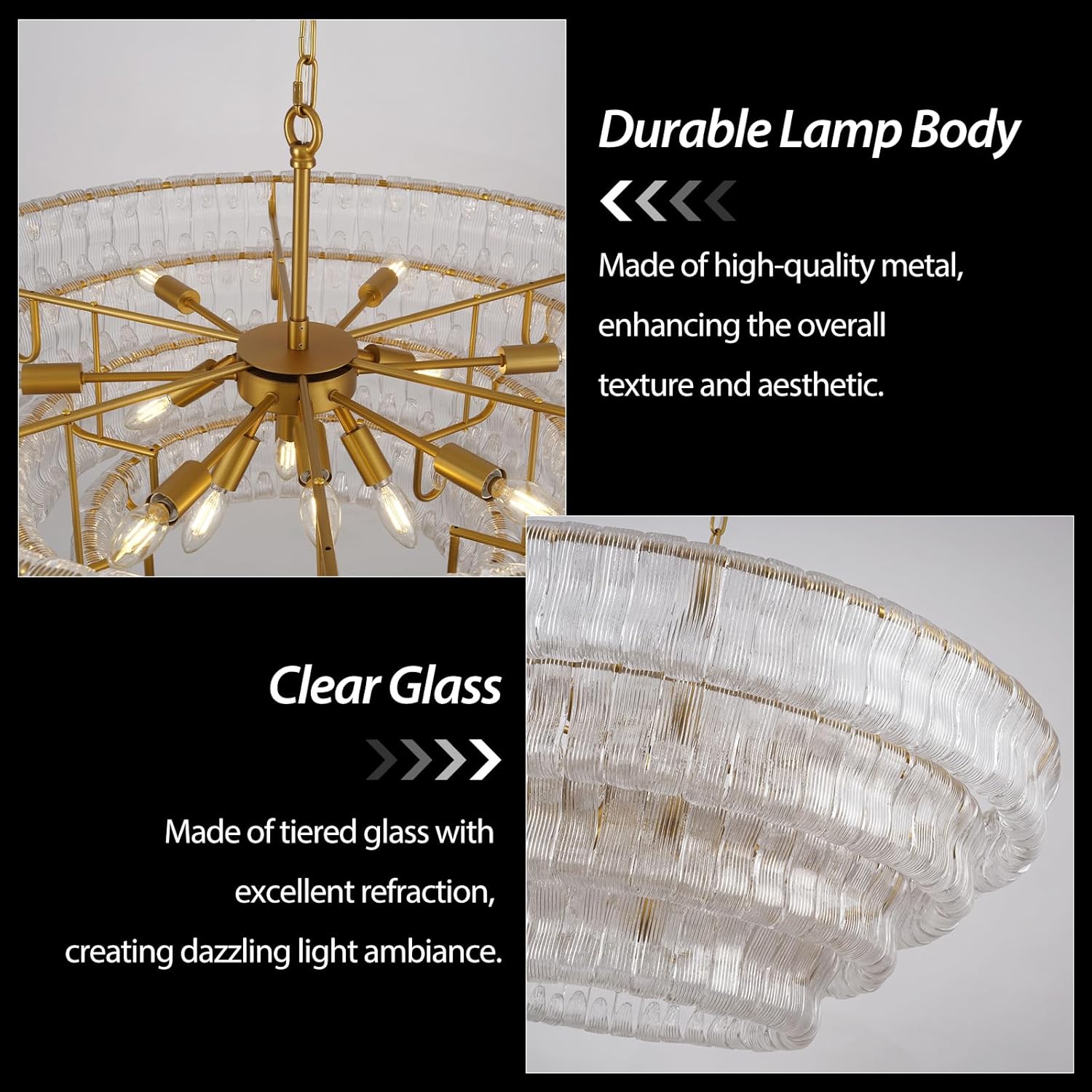 The frame of this round golden chandelier is made of iron, which is durable and sturdy. The surface is treated with a fine electroplating process. The dining room chandelier's shade is crafted with thickened glass and has a designed arc, enhancing the overall texture and aesthetic. The lampshade is made of 4-tiered glass, 232pcs clear glass are suspended on the round frame circle, combining with the room decorated to create an ambiance of elegance and luxury.