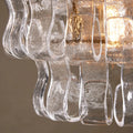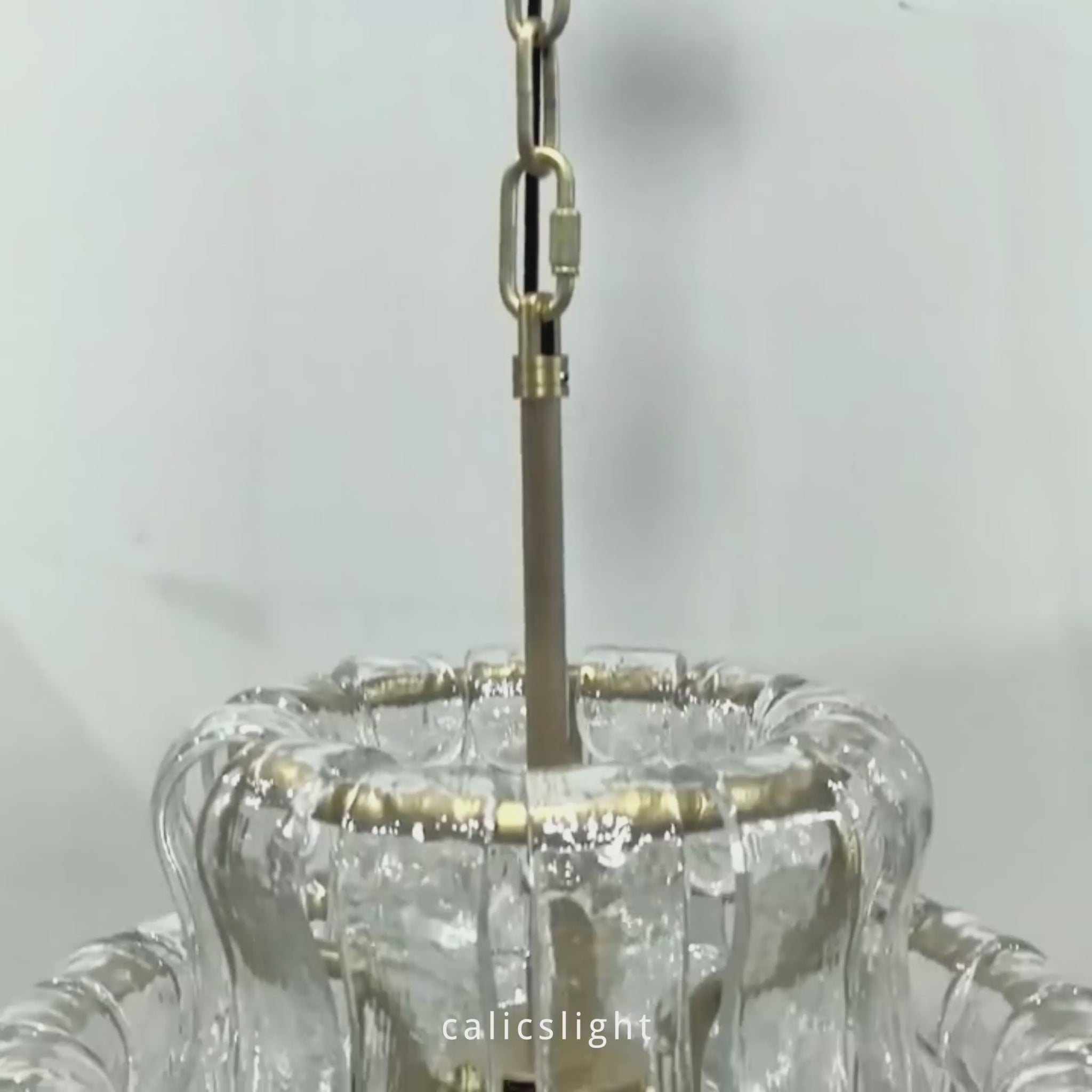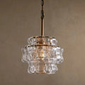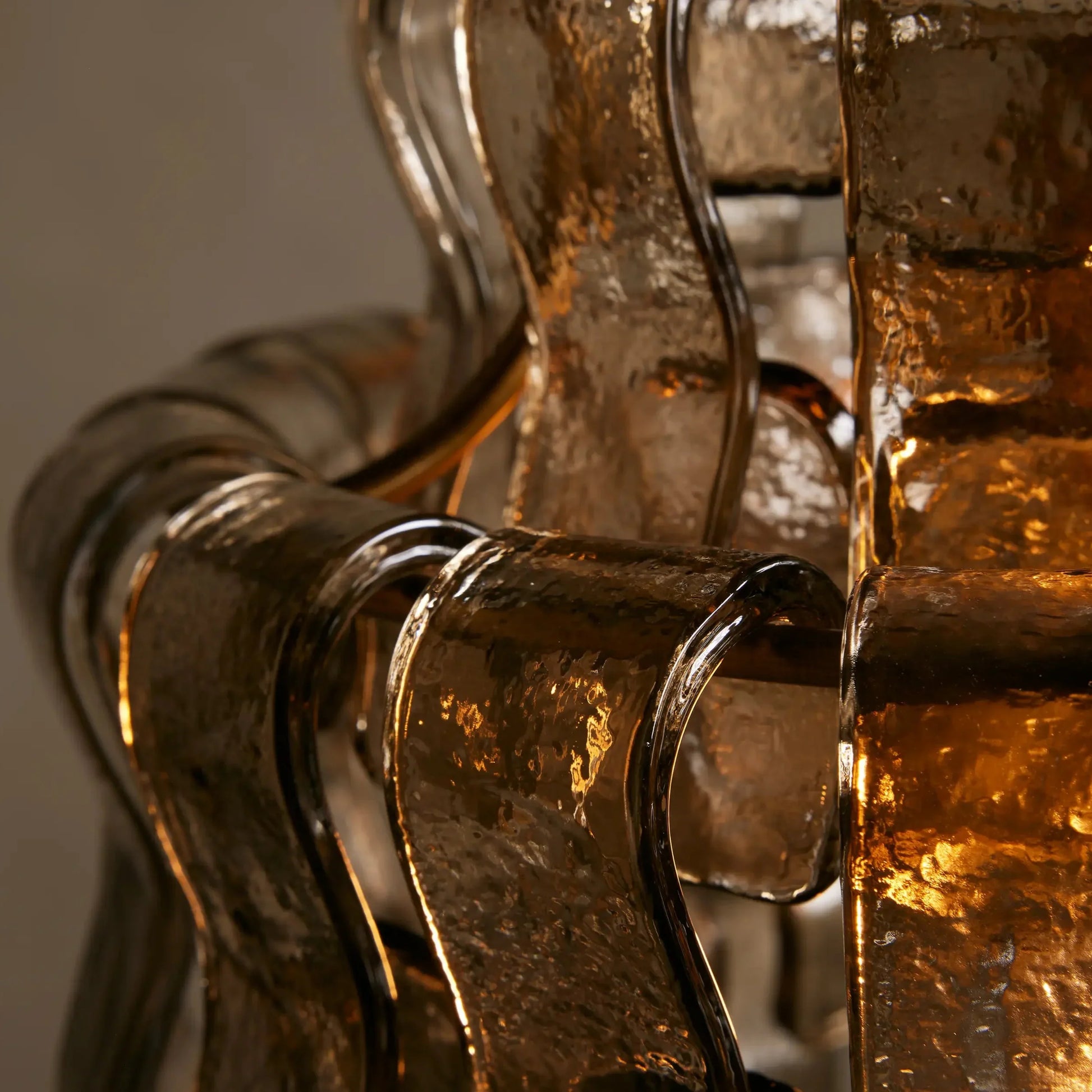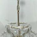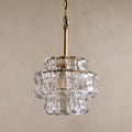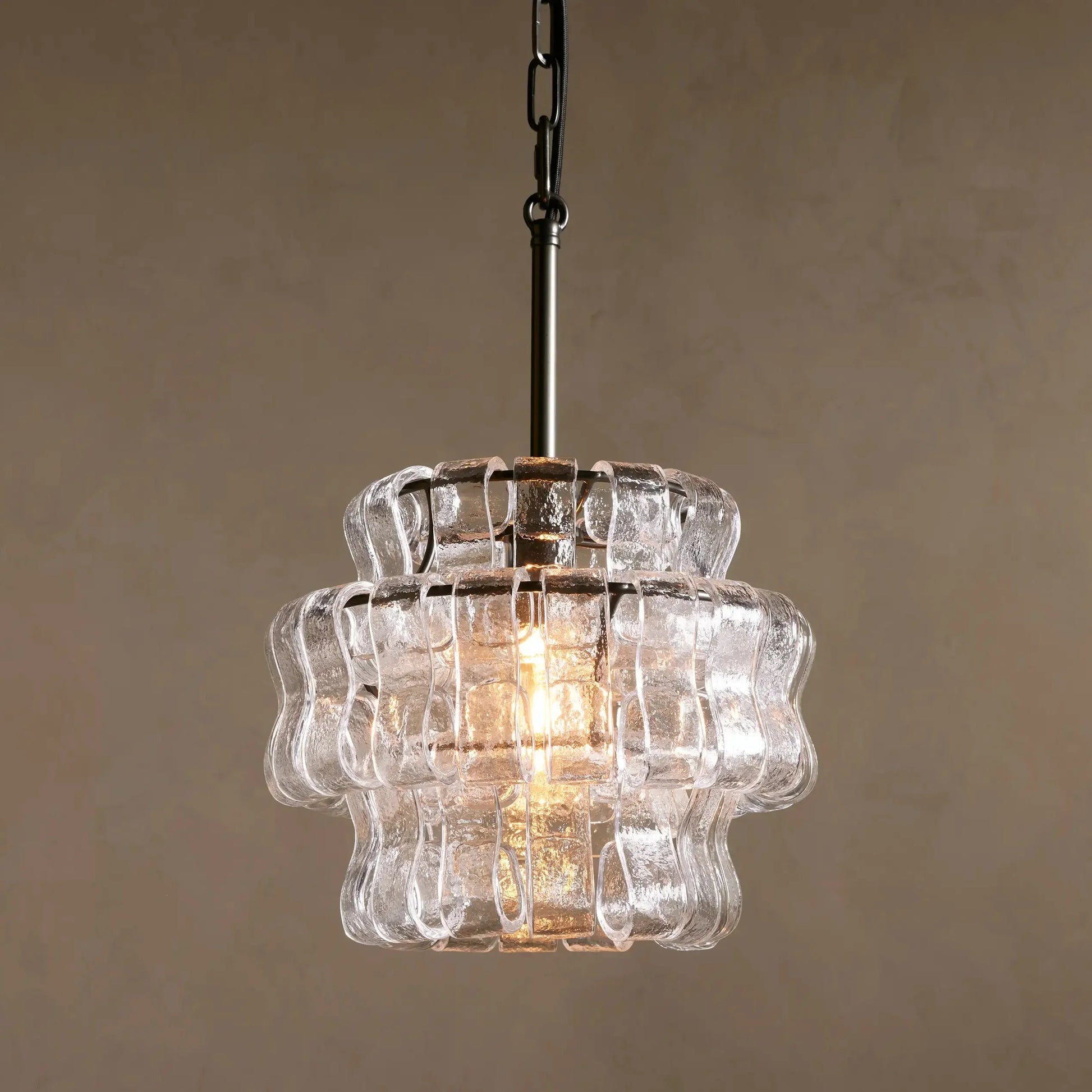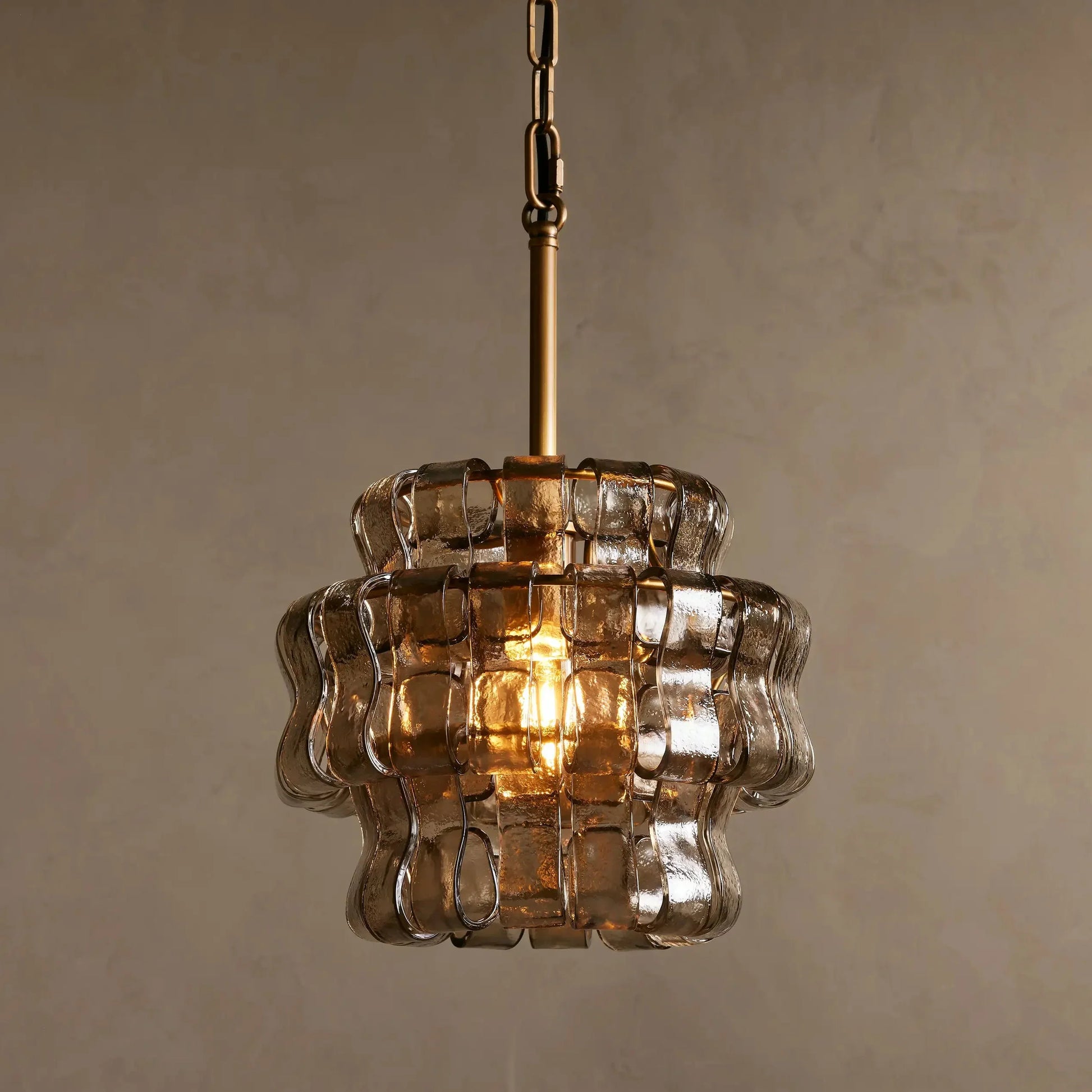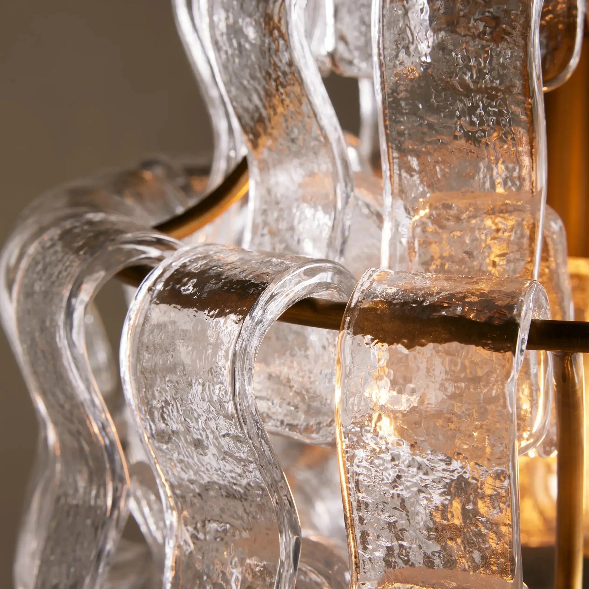 Inspired by the famous Italian decorative glass, the Ghiaccio Glass Pendant artfully diffuses light through curved textured glass pieces. It features an electroplated brass finish to elegantly illuminate any room.