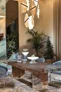 The Auralith Chandelier by Vakkerlight transforms natural elements into a floating sculpture of light. Featuring asymmetrically cut stone-like panels suspended in mid-air, this fixture captures the raw beauty of geological forms with refined modern elegance. The embedded light strips within each slab emit a warm, diffused glow—turning your space into an immersive work of art.