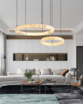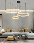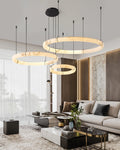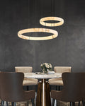 Elevate your space with the Modern Triple Ring Alabaster Pendant Light. This contemporary pendant light features three sleek, circular alabaster rings that emit a warm, inviting glow. Perfect for modern interiors, it adds a touch of elegance and sophistication to any room.