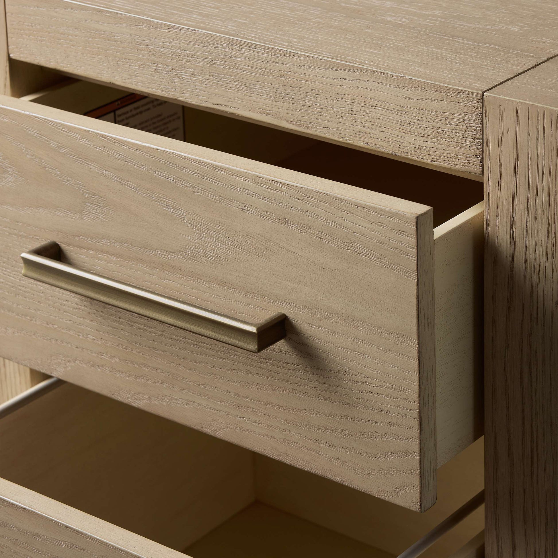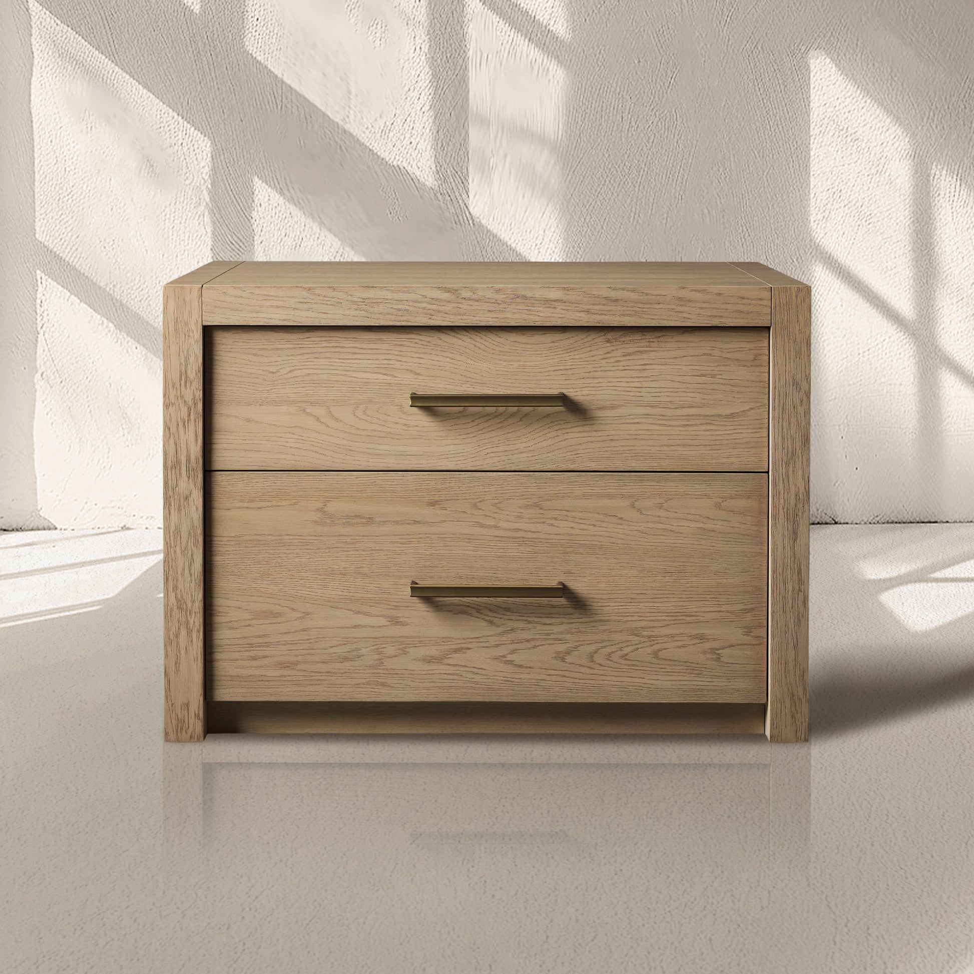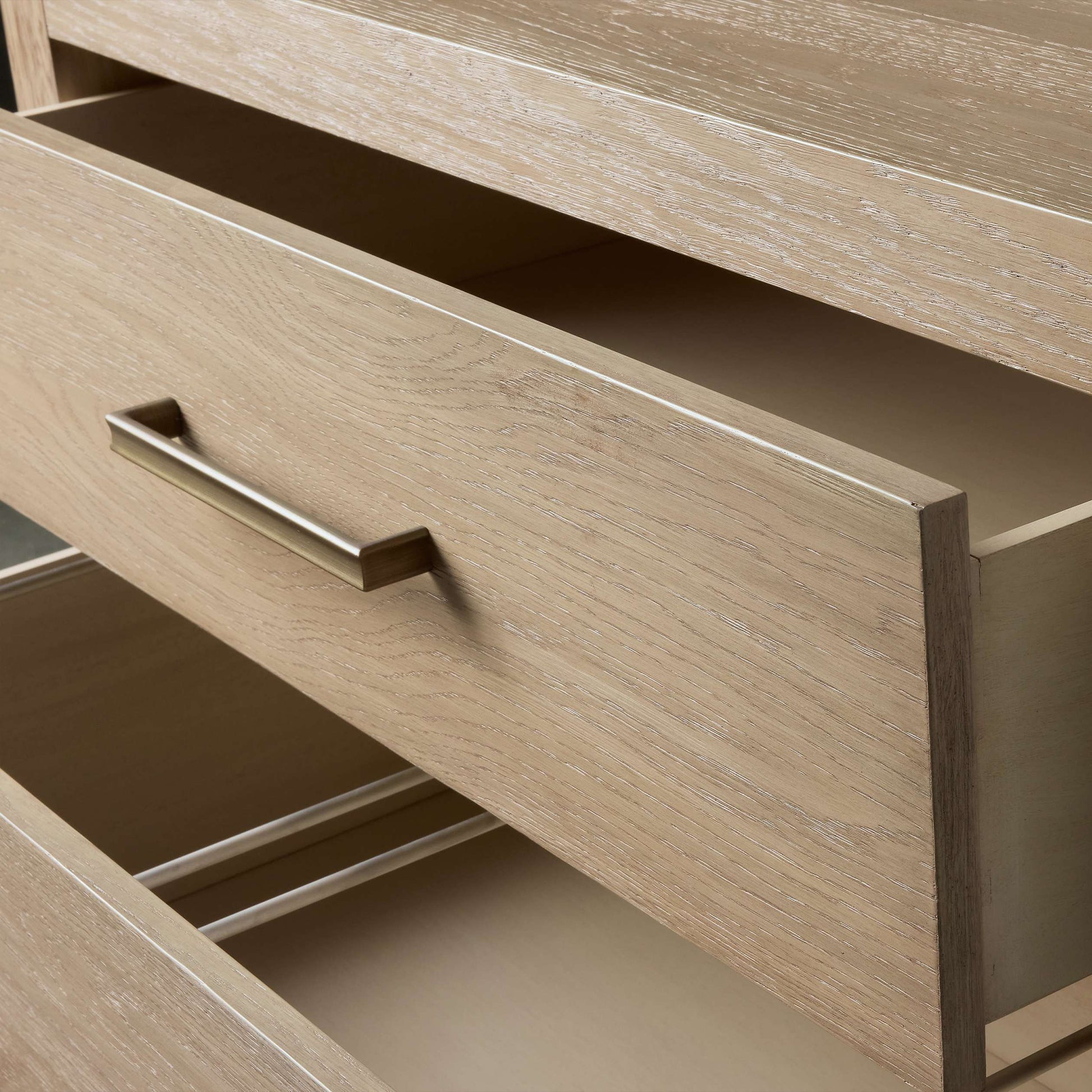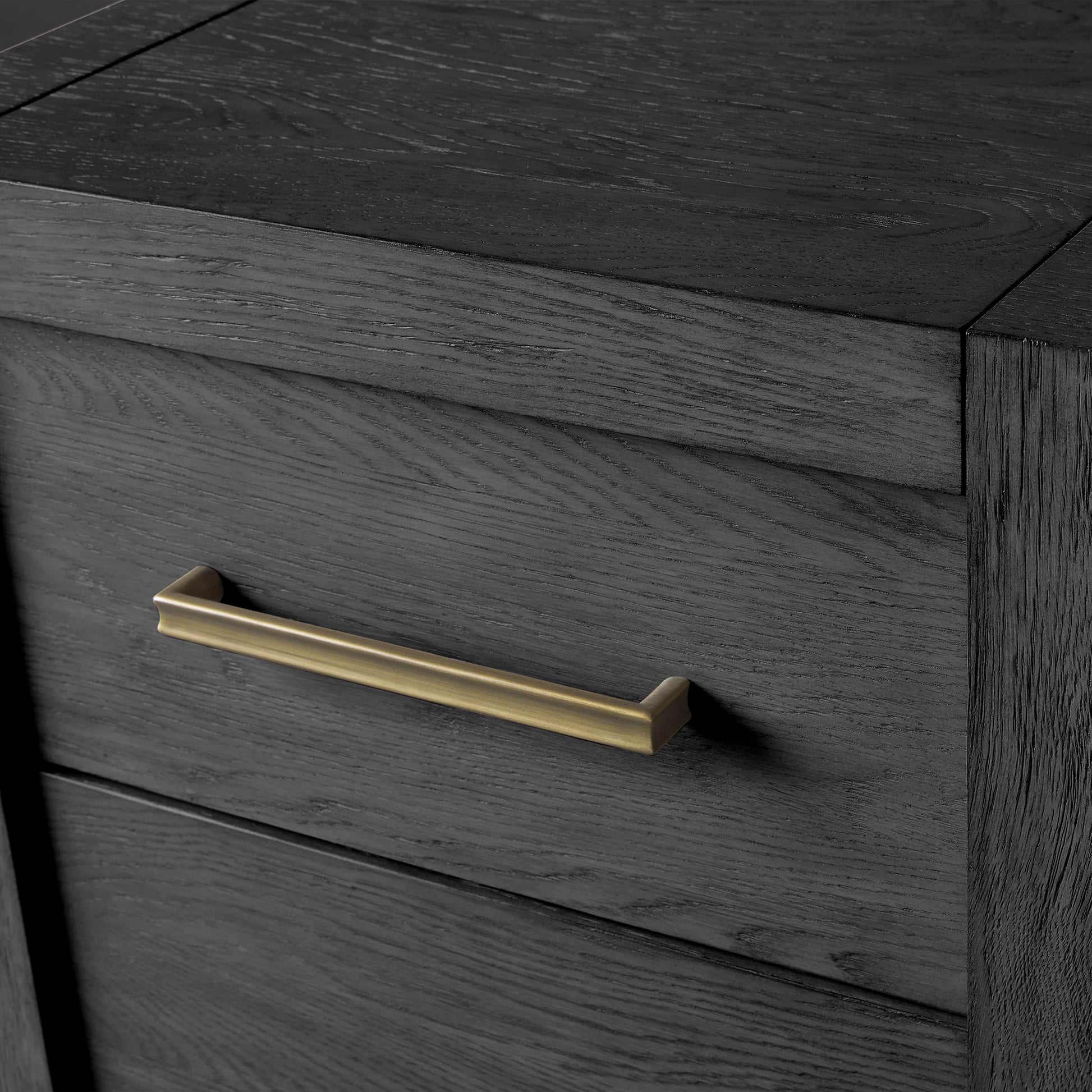Featuring bold, minimalist silhouettes, our Bood Collection redefines rustic design by celebrating the beauty of simple construction and highlighting the stunning grain of natural white oak. Each piece is meticulously crafted by skilled artisans and hand-finished through a detailed process—wire brushed, sanded, and treated with a six-step application of stain, glaze, sealer, and lacquer to achieve an elegant, "organically aged" patina. Designed with spacious storage for electronics, media, and décor, the collection is accentuated by beautiful brass hardware finished in a soft champagne tone, adding a touch of refined sophistication to its timeless appeal.