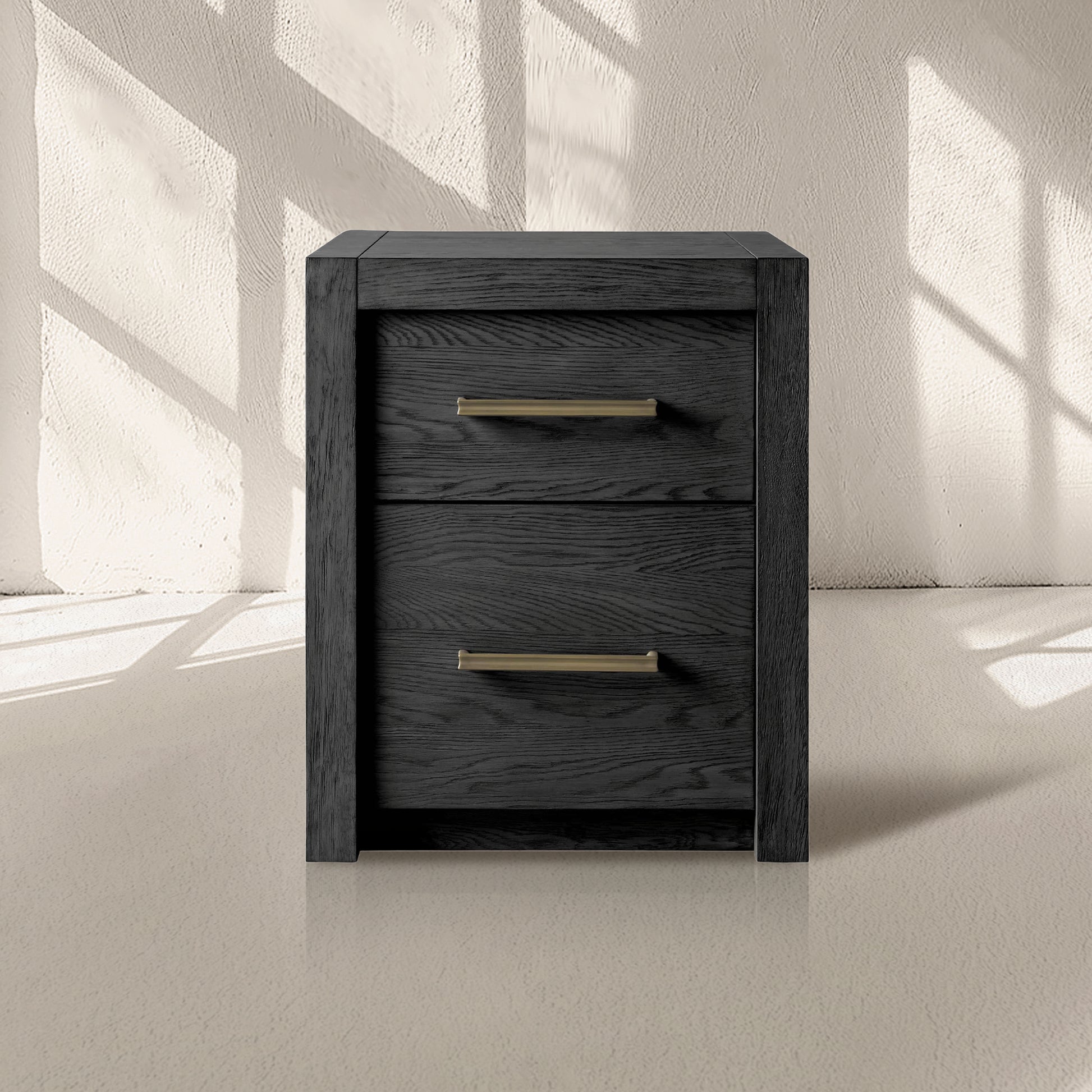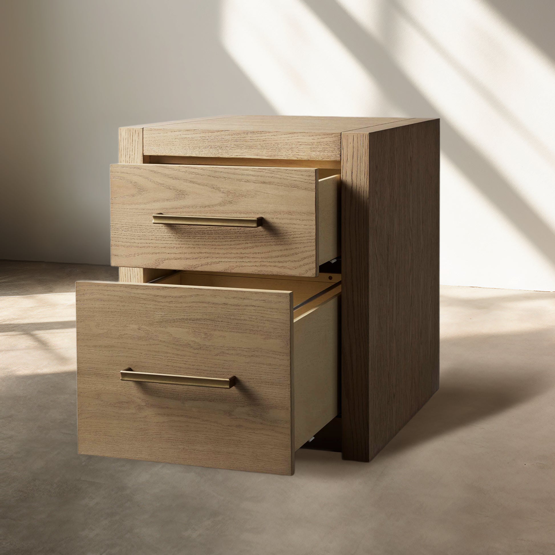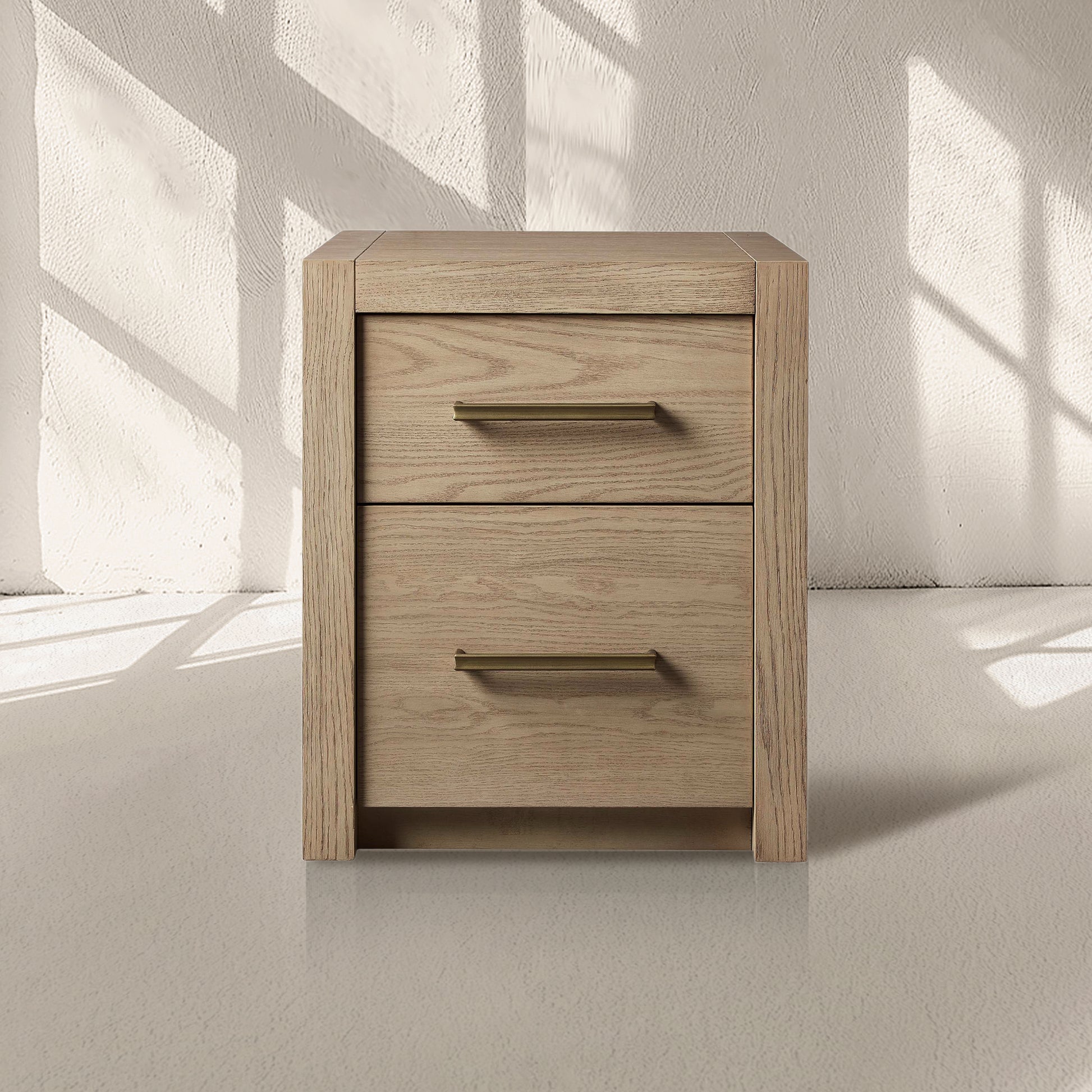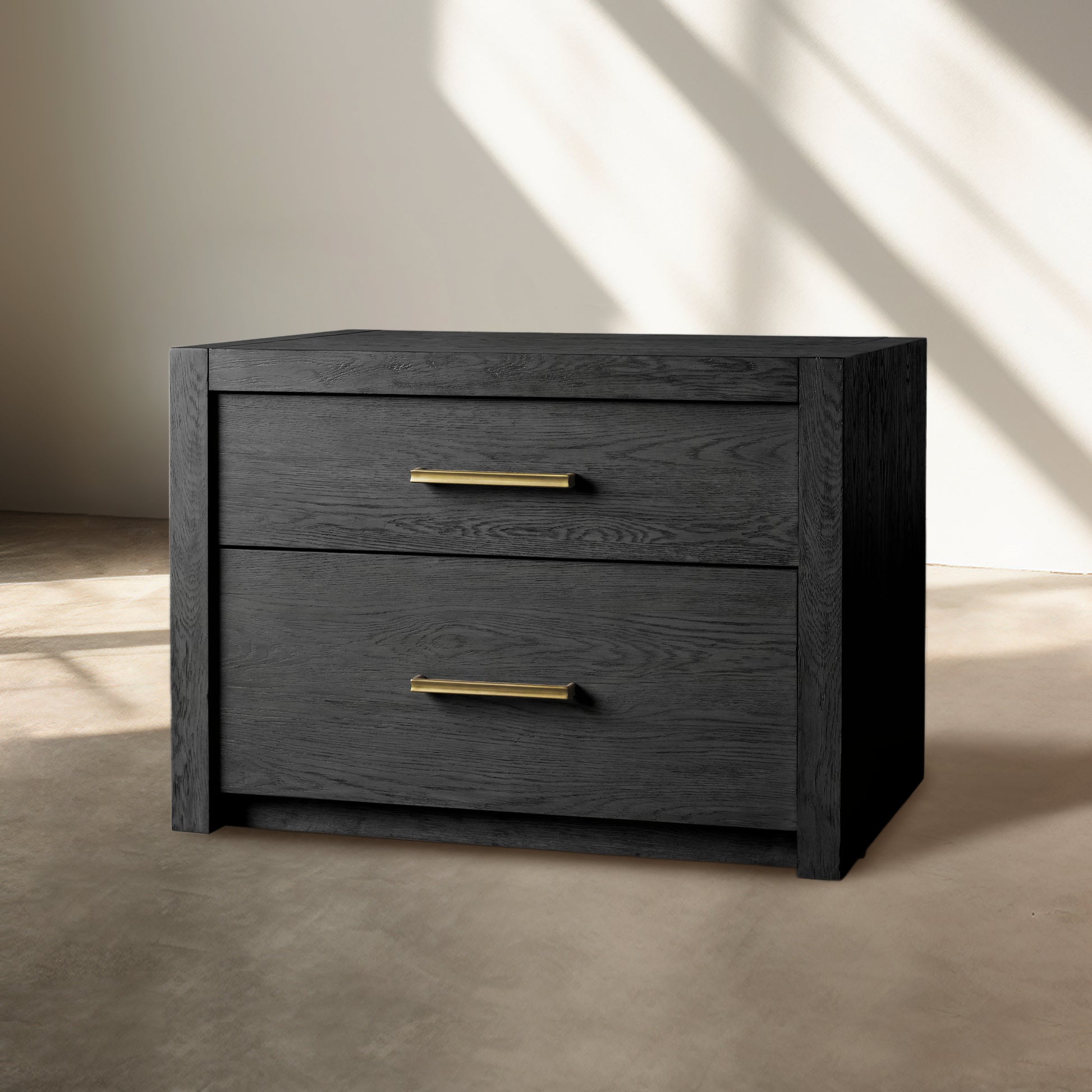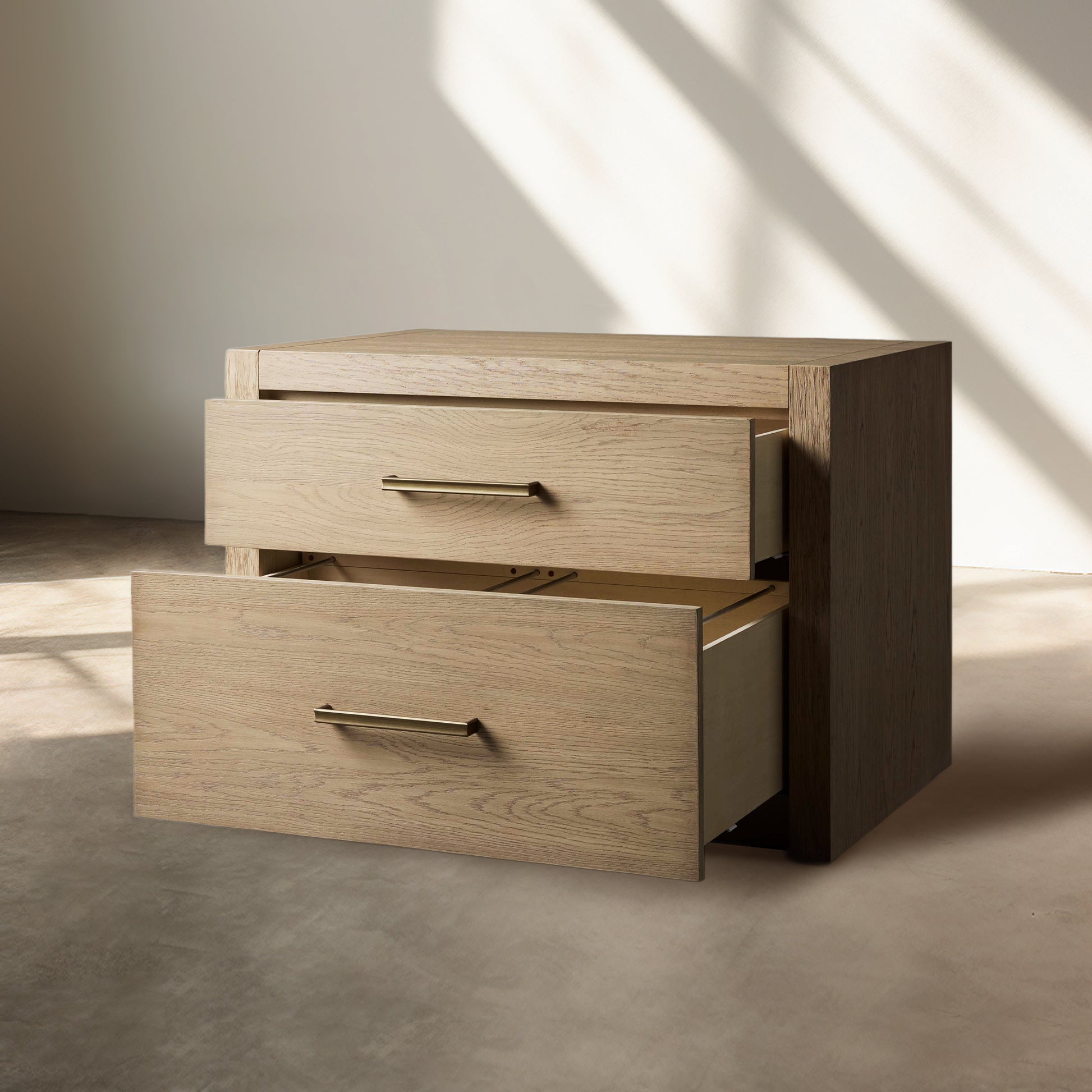 Featuring bold, minimalist silhouettes, our Bood Collection redefines rustic design by celebrating the beauty of simple construction and highlighting the stunning grain of natural white oak. Each piece is meticulously crafted by skilled artisans and hand-finished through a detailed process—wire brushed, sanded, and treated with a six-step application of stain, glaze, sealer, and lacquer to achieve an elegant, "organically aged" patina. Designed with spacious storage for electronics, media, and décor, the collection is accentuated by beautiful brass hardware finished in a soft champagne tone, adding a touch of refined sophistication to its timeless appeal.