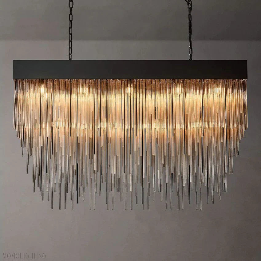 Ascade of crystal and metal rods coexist in this dazzling display of light. Artfully evoking rainfall frozen in time, hundreds of slender tubes are suspended asymmetrically from a sleek canopy, casting a refractive glow to dramatic effect.
