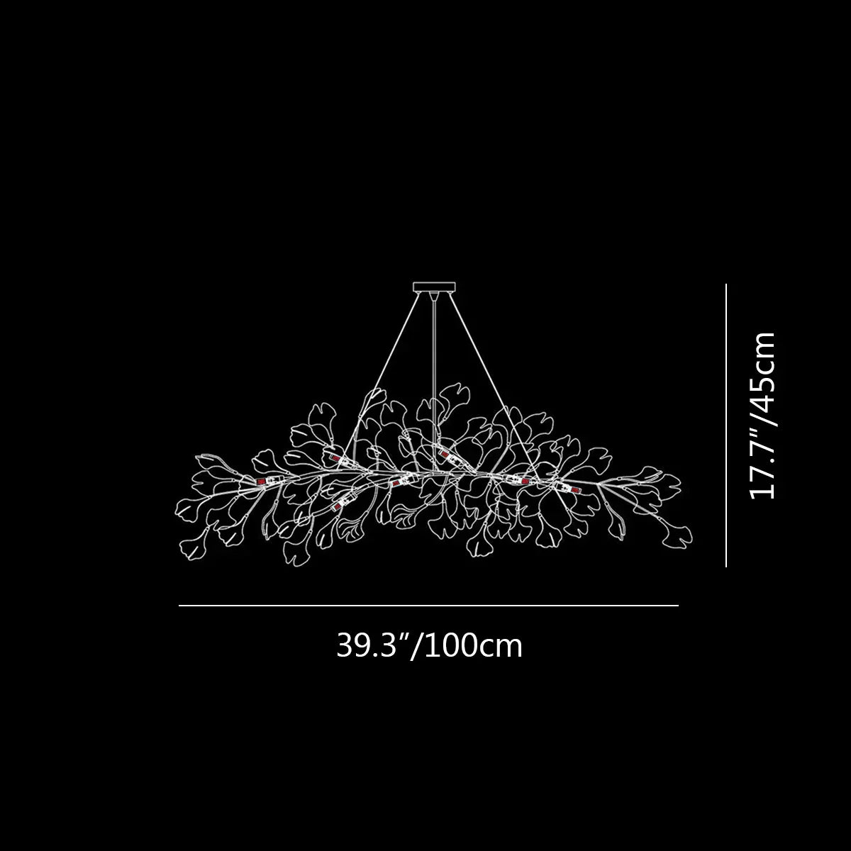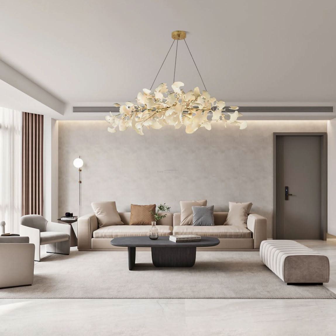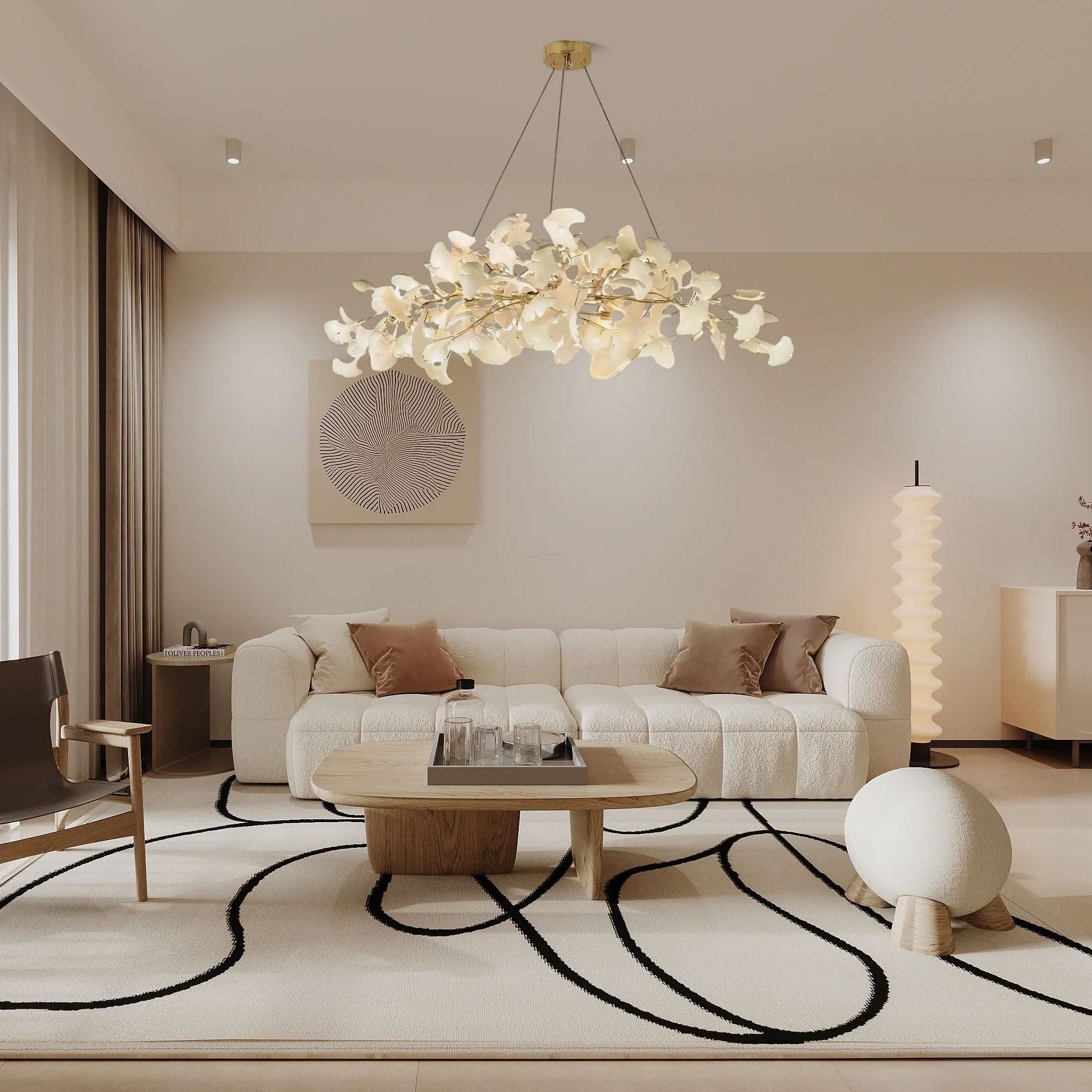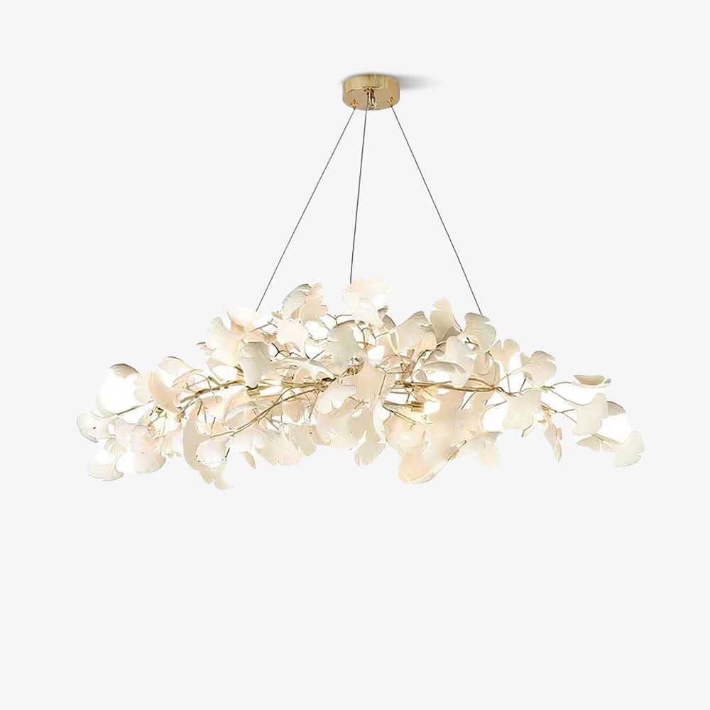 This Ginkgo Chandelier Style N combines luxury and nature, featuring a metal lamp body adorned with handmade ceramic petals. The chandelier’s unique design blends light and natural elements, creating a warm and soothing atmosphere.