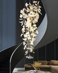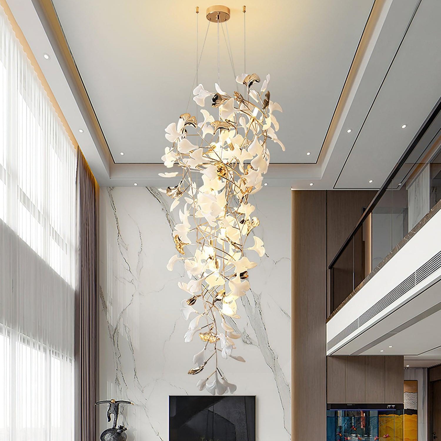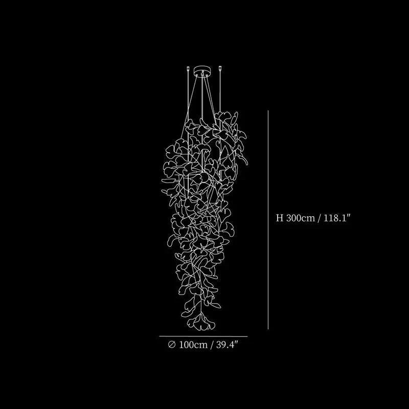 Ginkgo chandelier with Long Branch are bespoke installations featuring handcrafted porcelain leaves. The interplay between ceramic and light has the ability to evoke a sense of well-being and warmth. Beyond its primary function of illuminating a space, the chandelier transforms into a captivating artwork by defining its shape and presence through self-illumination.