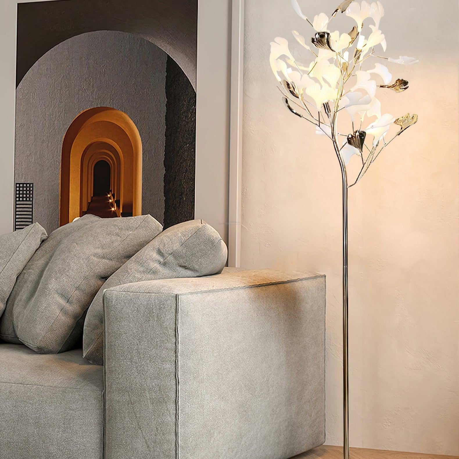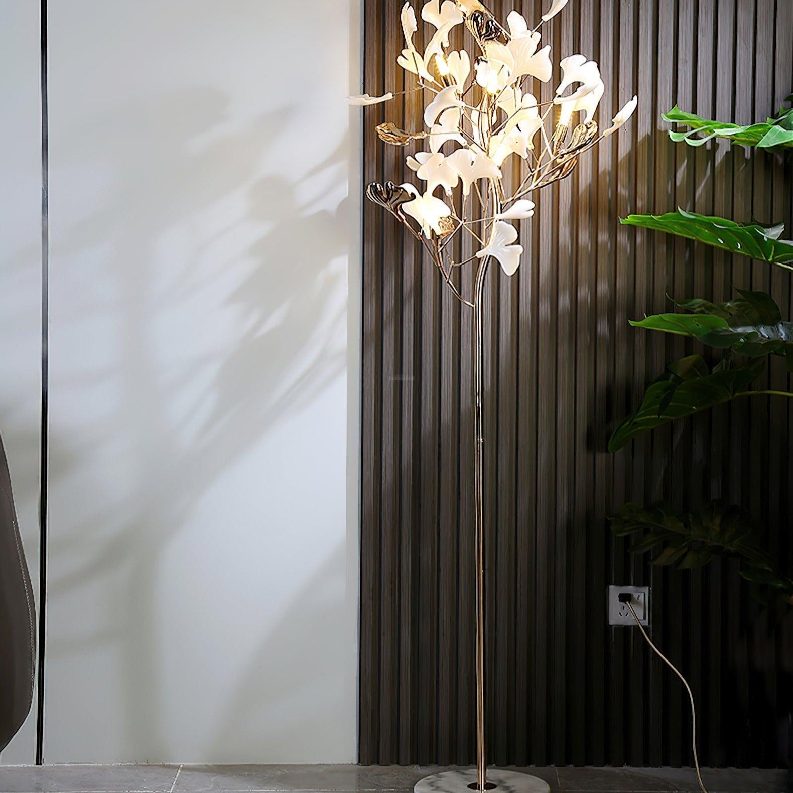 Gingko Floor Lamps are impressive bespoke installations, composed of handcrafted porcelain leaves. The interplay between ceramic and light has the power to create a sense of well-being and a warm atmosphere. The light sculpture goes beyond its functional purpose of illuminating a space. By casting light upon itself, it defines its own shape and presence, transforming into a mesmerizing artwork.