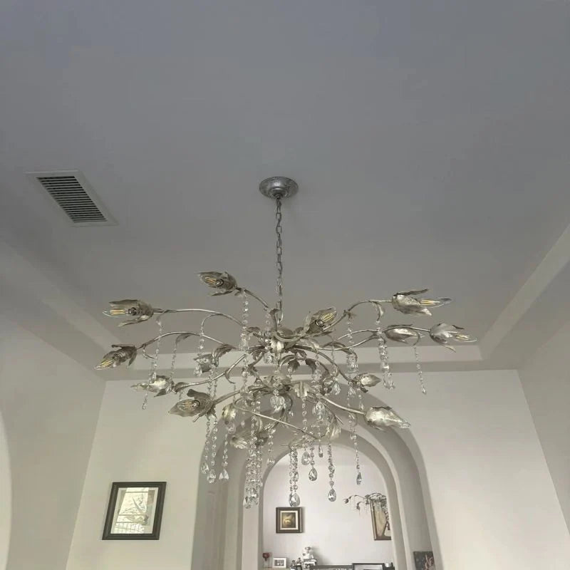 This is collection combines Gothic-style ironwork with Italian glass. The features sliver wrought iron with delicate lines, exuding a unique classical charm. The lampshade is made from exquisite Italian glass, available in colored or clear options, casting a soft and enchanting glow when the light passes through.And creating a mysterious and elegant ambiance, making it perfect for spaces like living rooms or dining areas.