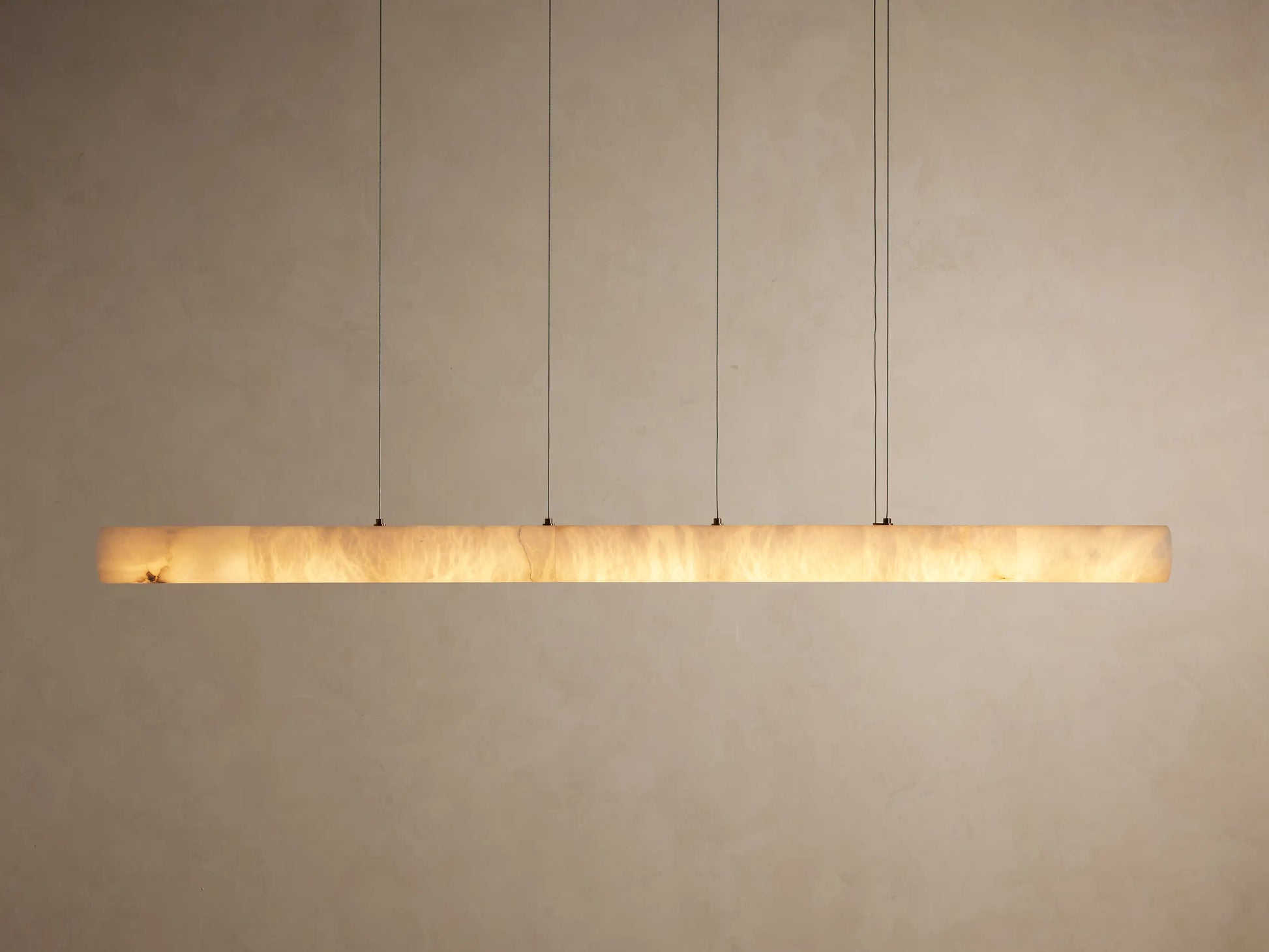 Crafted from ethereal Spanish alabaster, our Halima Lighting Collection glows from within—its integrated LED lights casting a warm, diffused radiance through the stone’s natural veining. Suspended by minimalist cables, Halima’s sleek design floats effortlessly overhead, blending timeless materiality with modern style.