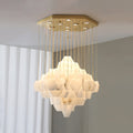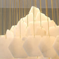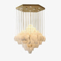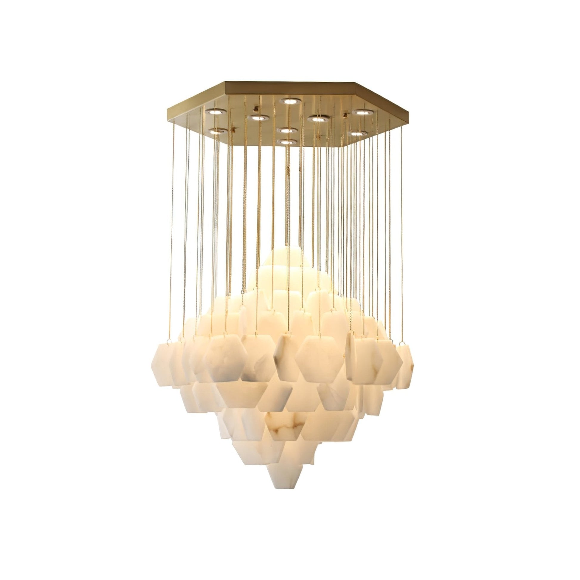 Experience luxury with the Hexa Alabaster Cascade Chandelier. Featuring hexagonal alabaster pieces suspended from a sleek gold frame, it casts a warm, diffused glow perfect for elegant dining rooms or grand entryways.