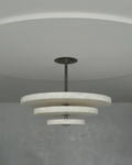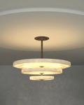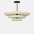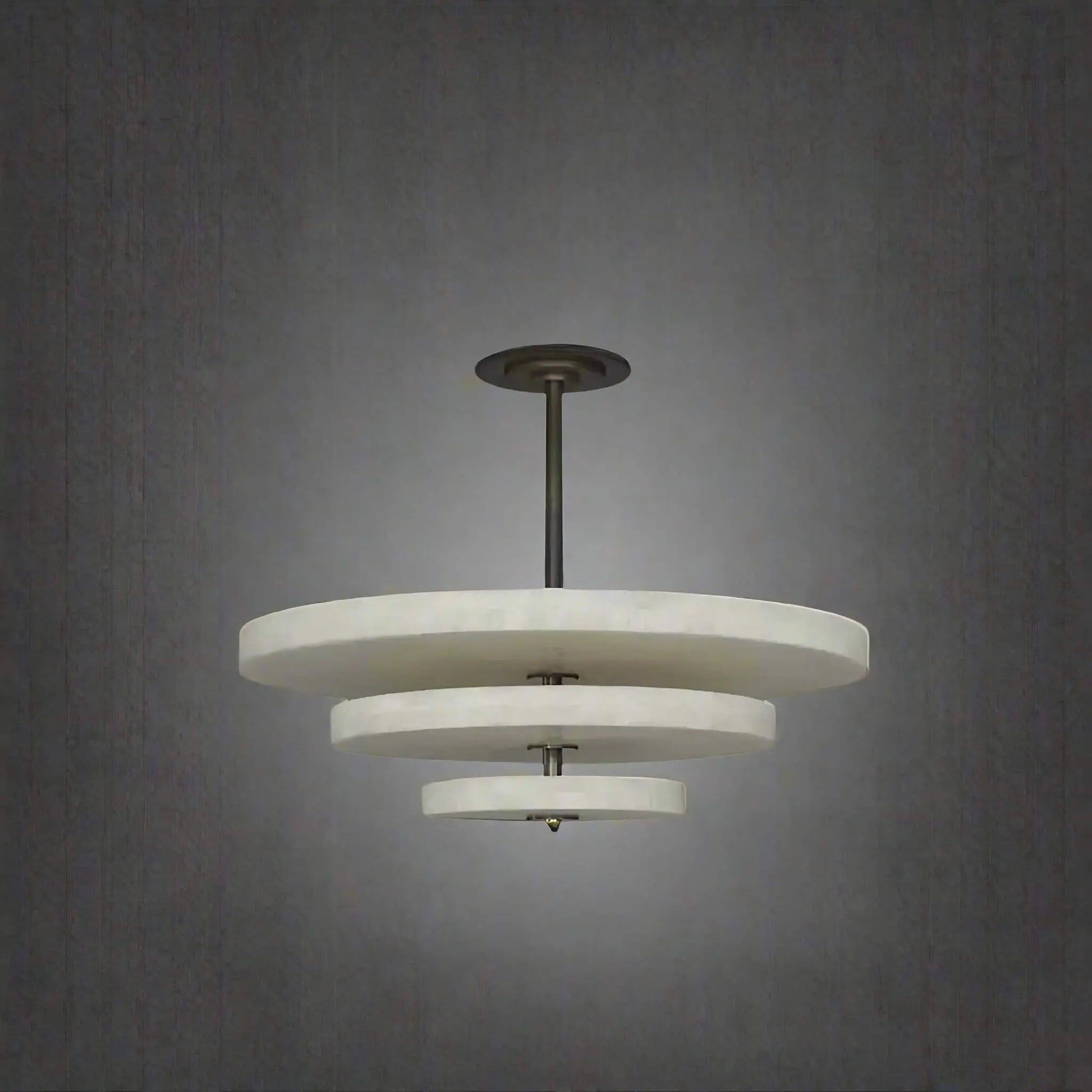 The Ice Queen Alabaster Chandelier showcases a refined tiered design with three smooth alabaster layers that gently diffuse light, producing a warm and inviting ambiance. Its classic round silhouette, enhanced by subtle veining, reflects timeless elegance and luxury. Suspended from a brass metal canopy, this fixture offers a striking contrast that highlights the natural beauty of the stone, making it an expert choice for sophisticated interiors.