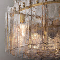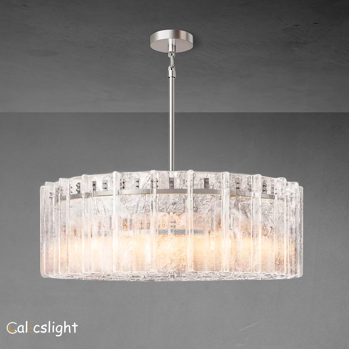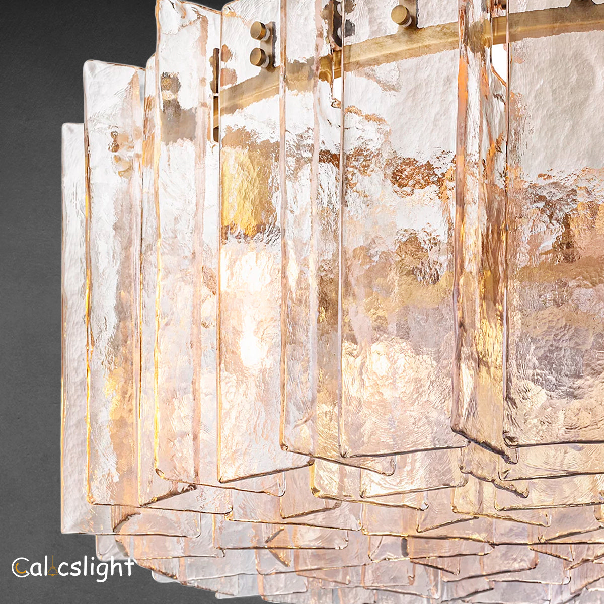 Crafted of solid cast glass, the Ladika collection's interlocking planes recall the geometric precision of the midcentury International Style. A study in repetition and rhythm, the linear form employs open space to lend a weightless feel. Gently rounded corners on the fluid, rippled panes subtly soften the outline, while diffused light glows from within.
