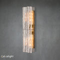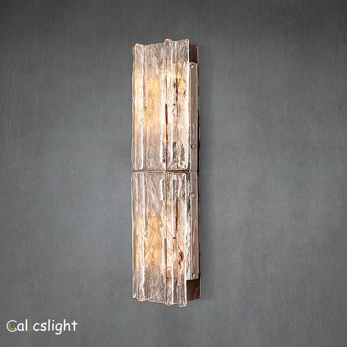 Crafted of solid cast glass, the Ladika collection's interlocking planes recall the geometric precision of the midcentury International Style. A study in repetition and rhythm, the linear form employs open space to lend a weightless feel. Gently rounded corners on the fluid, rippled panes subtly soften the outline, while diffused light glows from within.