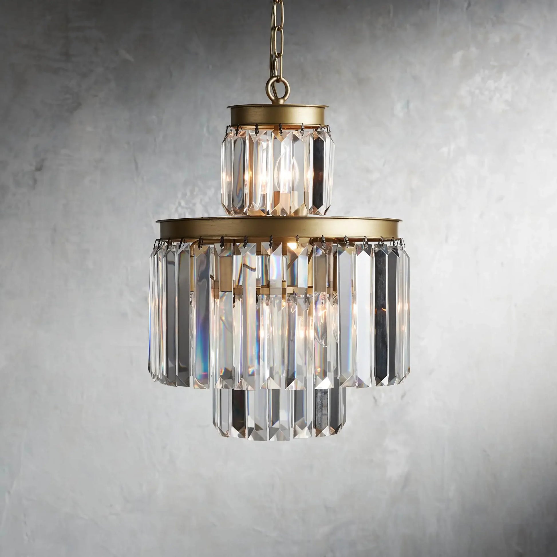 French Art Deco style of the 1920s is reborn in our glamorous Reis Lighting Collection, featuring layered row upon row of faceted glass crystals from a rustic iron frame.