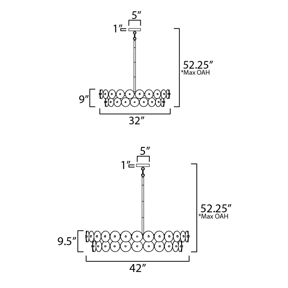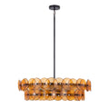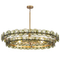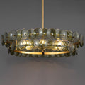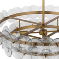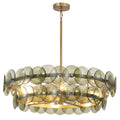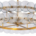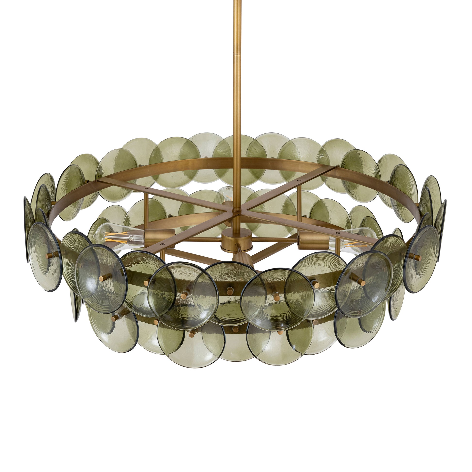 Overlapping handmade pressed glass disks are mounted on metal frames reminiscent to Mid-Century Italian design in the Loren Chandelier. The texture of the glass softens the glare of light bulbs creating a warmer glow that is enhanced with the use of colored glass options.