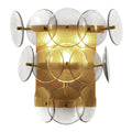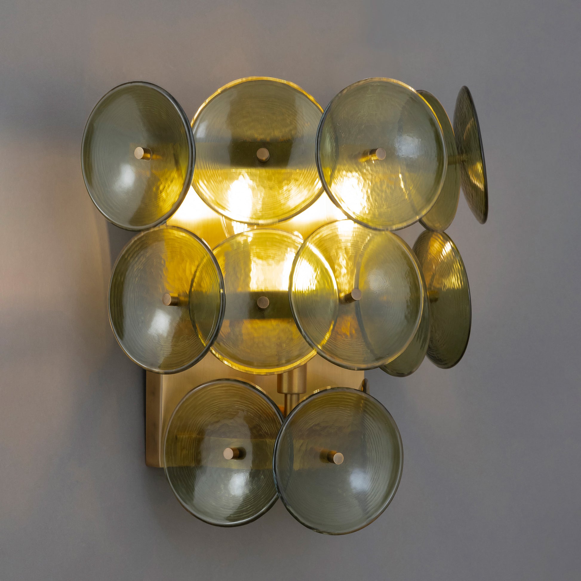Inspired by Mid-Century Italian design, the Loren Wall Sconce features beautifully textured recycled glass in an elegant silhouette. The overlapping pressed glass disks are handmade and mounted on metal frames to create the shape. The different glass options soften the light and provide gentle illumination.