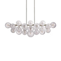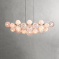The Mandoza Linear Chandelier is a stunning statement piece featuring 31 hand-blown glass globes suspended from a sleek, elongated frame. With its burnished brass finish and distinctive bubble-glass texture, it blends modern elegance with artisanal charm—perfect for dining tables, kitchen islands, or open living spaces.