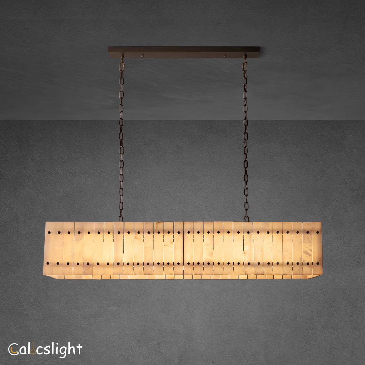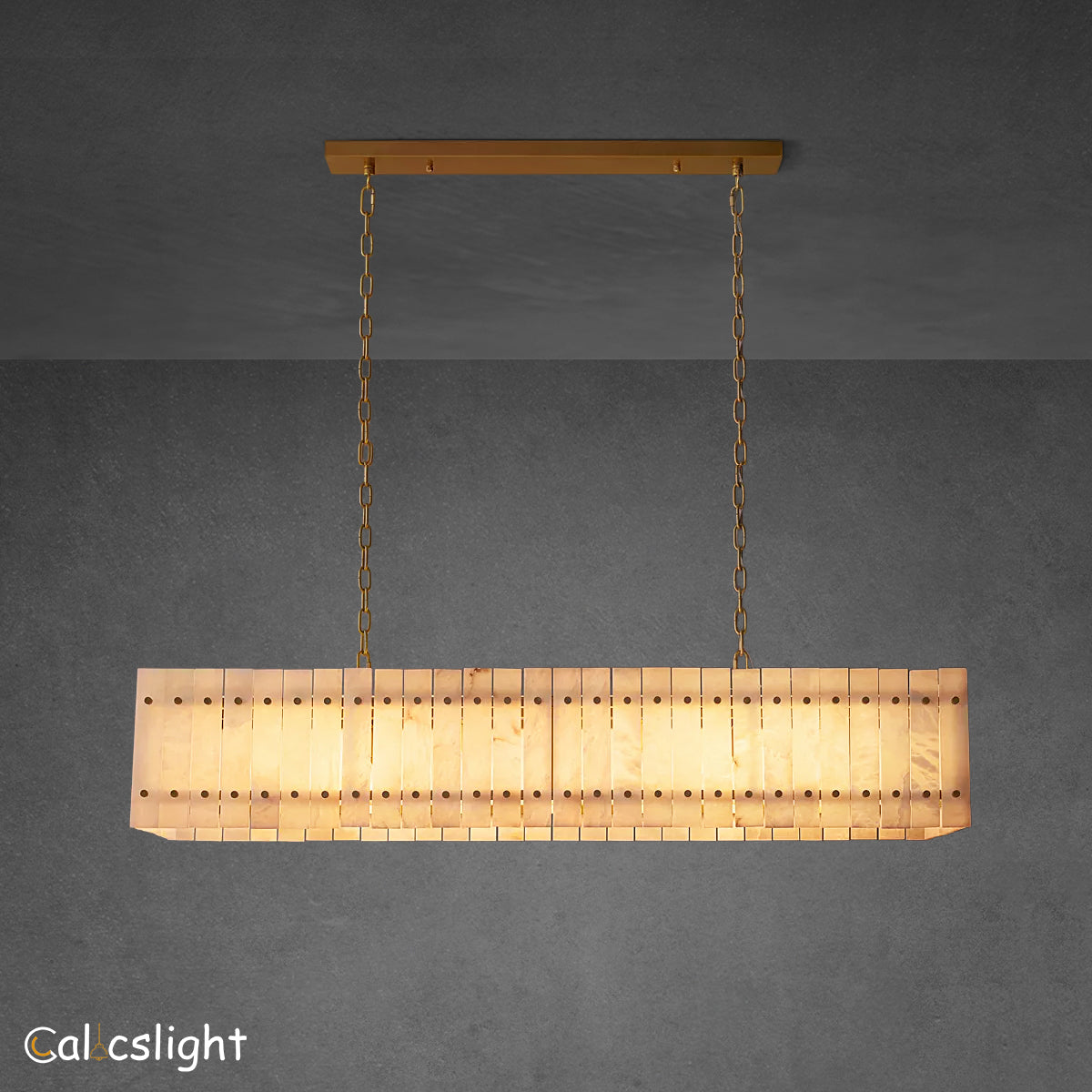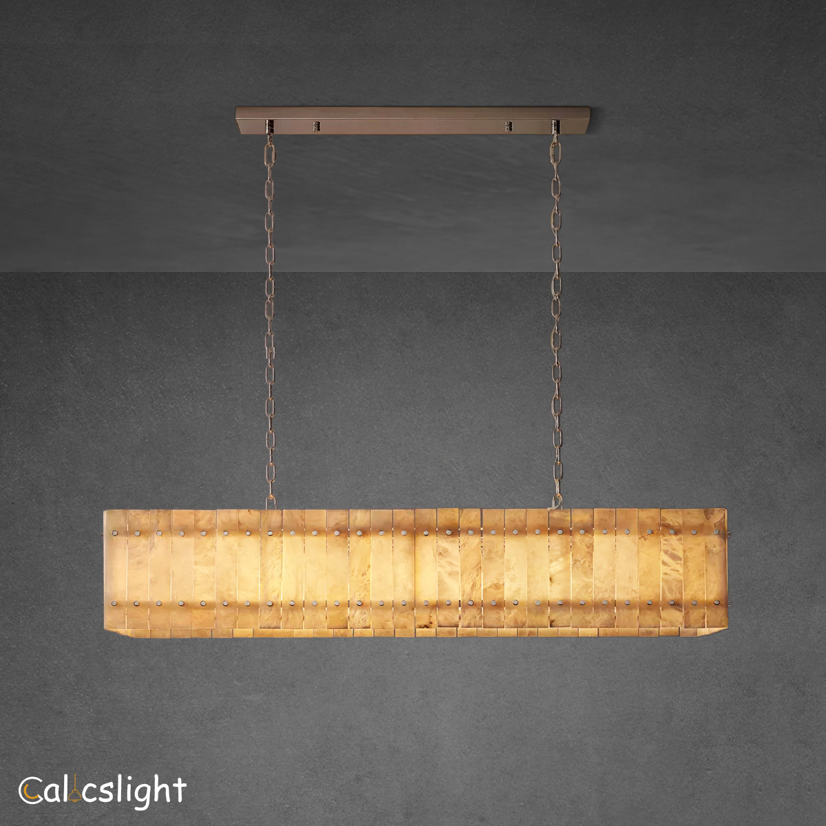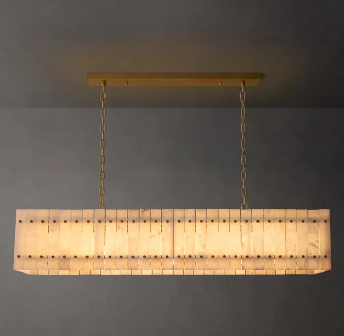 The Marcus Alabaster Linear Chandelier 54" is a striking, contemporary lighting fixture that combines sleek design with timeless elegance. Featuring a long, linear shape and crafted from beautiful alabaster, it offers a warm, inviting glow perfect for dining rooms, kitchens, or modern living spaces. With a 54-inch length, this chandelier makes a bold statement, providing both functional illumination and a sophisticated focal point. Its refined design complements a variety of interior styles, adding a touch of luxury and class to any room.