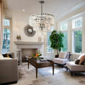 This chandelier showcases a dramatic tiered silhouette formed by over 600 precisely arranged K9 crystal pieces. Each interlocking glass element captures and refracts light, creating a radiant cascade that sparkles from every angle. Suspended with minimal hardware for a floating effect, the round form adds sculptural elegance to dining rooms, foyers, or grand living spaces.