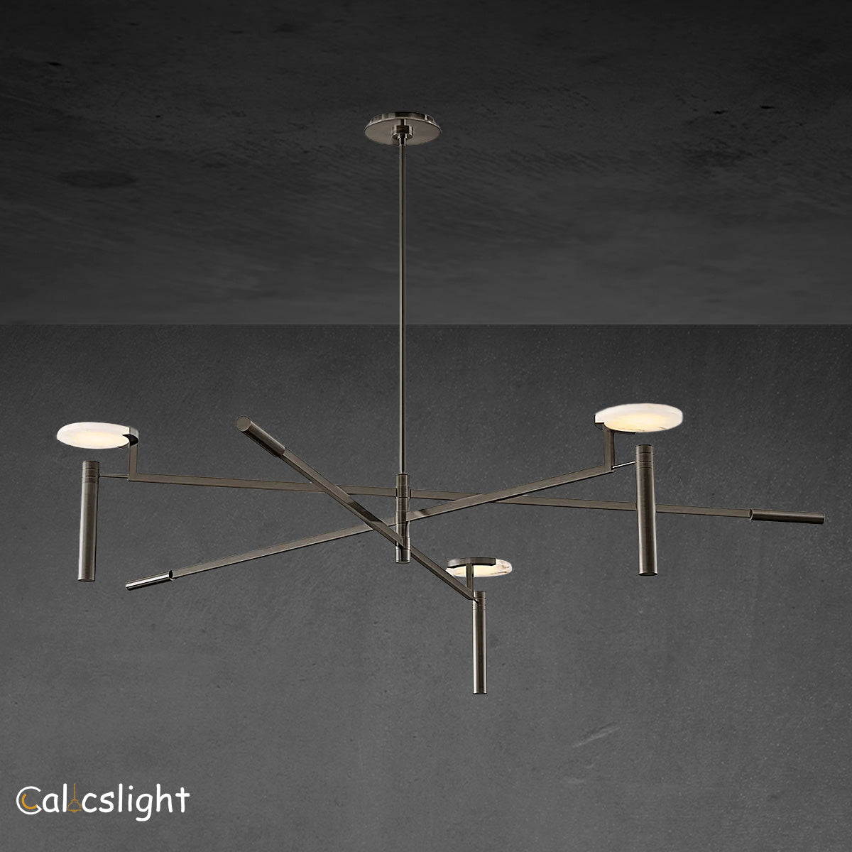 Inspired by mid-century Italian design, rich natural alabaster brings sophistication to the Melange collection. Three slender snowflake discs seem to float above a restrained brass armature. Light passes through the translucent stones, radiating a warm glow.