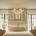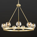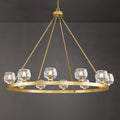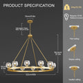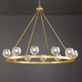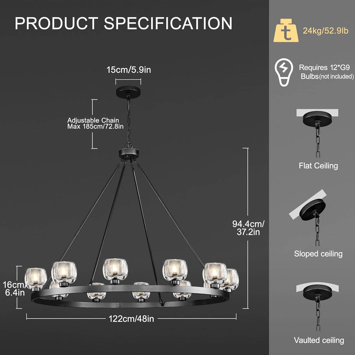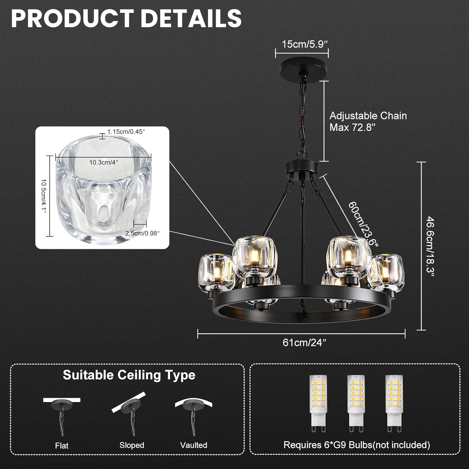 Farmhouse wagon wheel chandelier is made of specially designed glass shade & thicker metal, crafted for durability. Rust and oxidation resistant brass finish with unique glass shade gives the brass chandelier a cool & modern style that fits your vintage, rustic, luxury style and enhances your space.