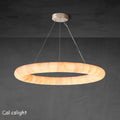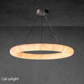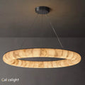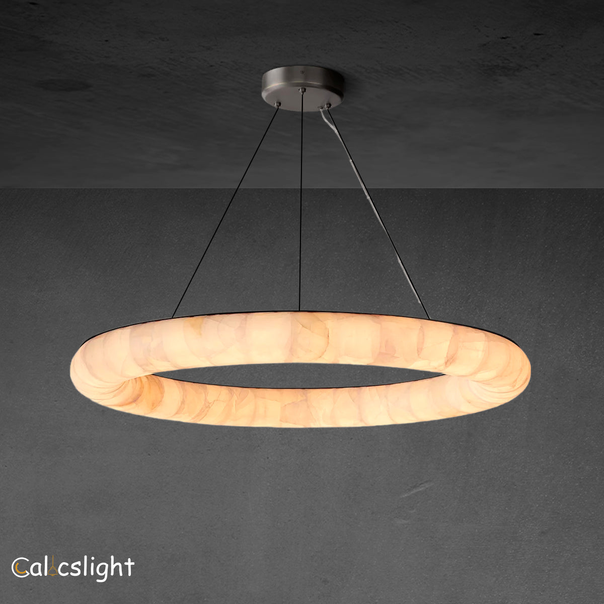 Minimalist in form, dramatic in effect, our Ricco Series Lisse chandelier celebrates the beauty of calcite, a translucent stone with a warm, natural glow. Suspended from slender steel cables, a halo of polished stone is expertly pieced to create a smooth, continuous surface, while subtle illumination from within highlights the organic coloration and veining. Each fixture is a one-of-a-kind statement.