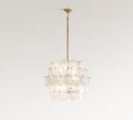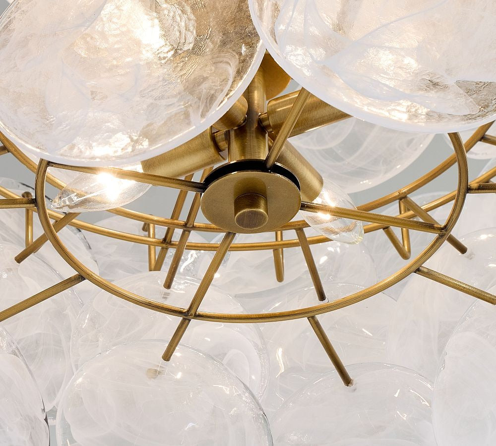 Riviera series is defined by its handcrafted glass discs — each piece carrying delicate textures and subtle variations that catch the light in unique ways. Layered one over another, the translucent forms create a sculptural presence, softening illumination into a warm, cloud-like glow. Paired with refined metal accents, the design blends artistry with elegance, making every fixture not just a source of light, but a statement centerpiece.
