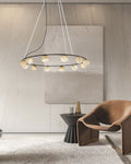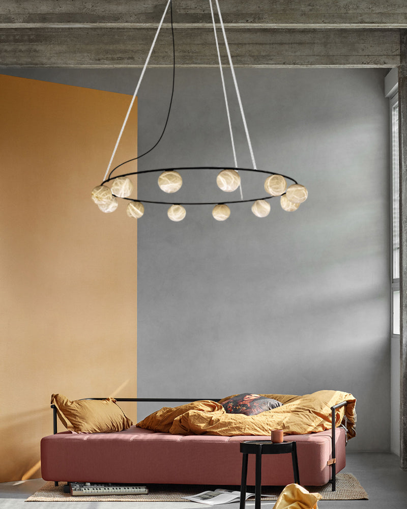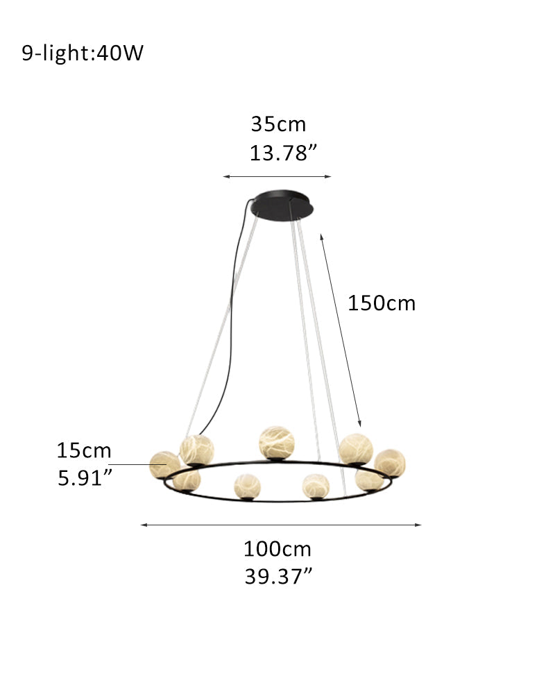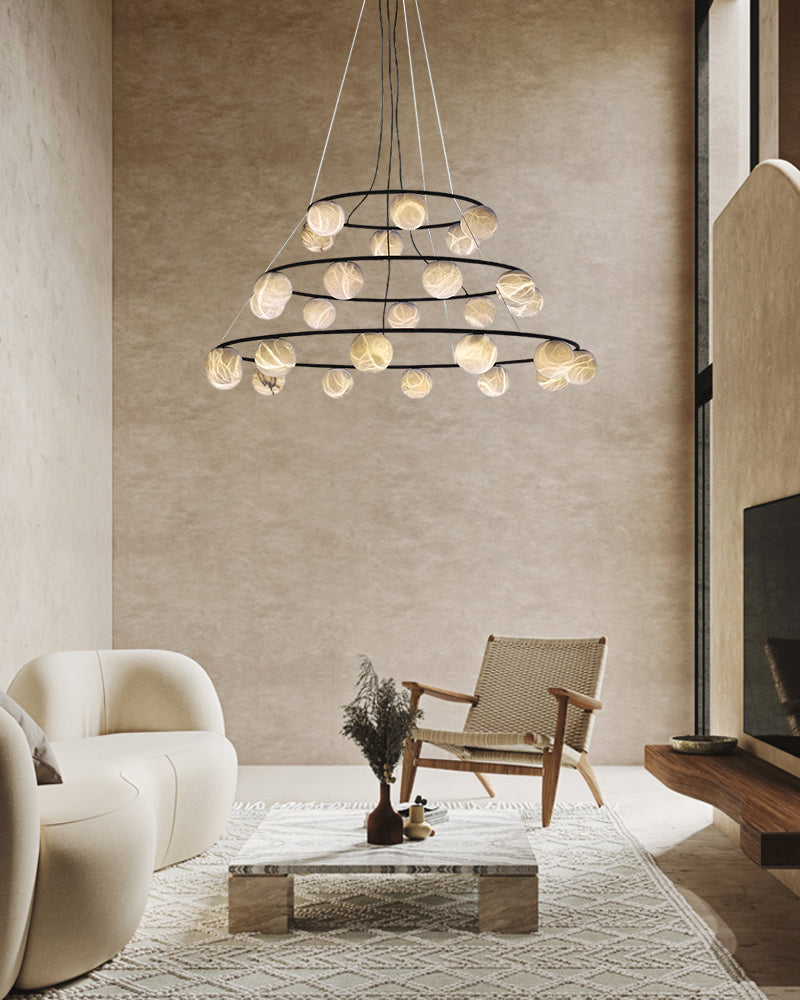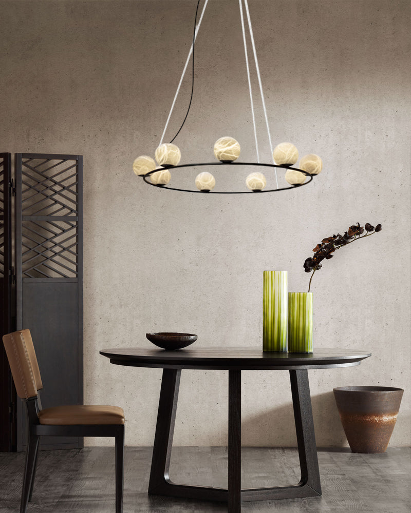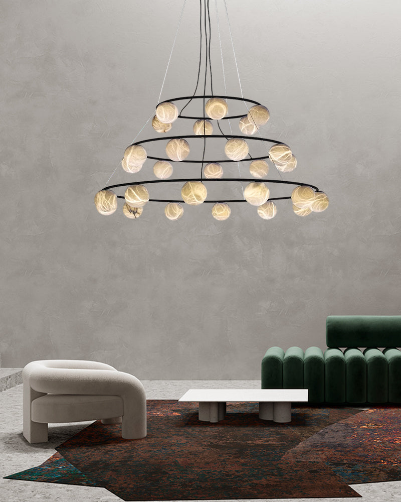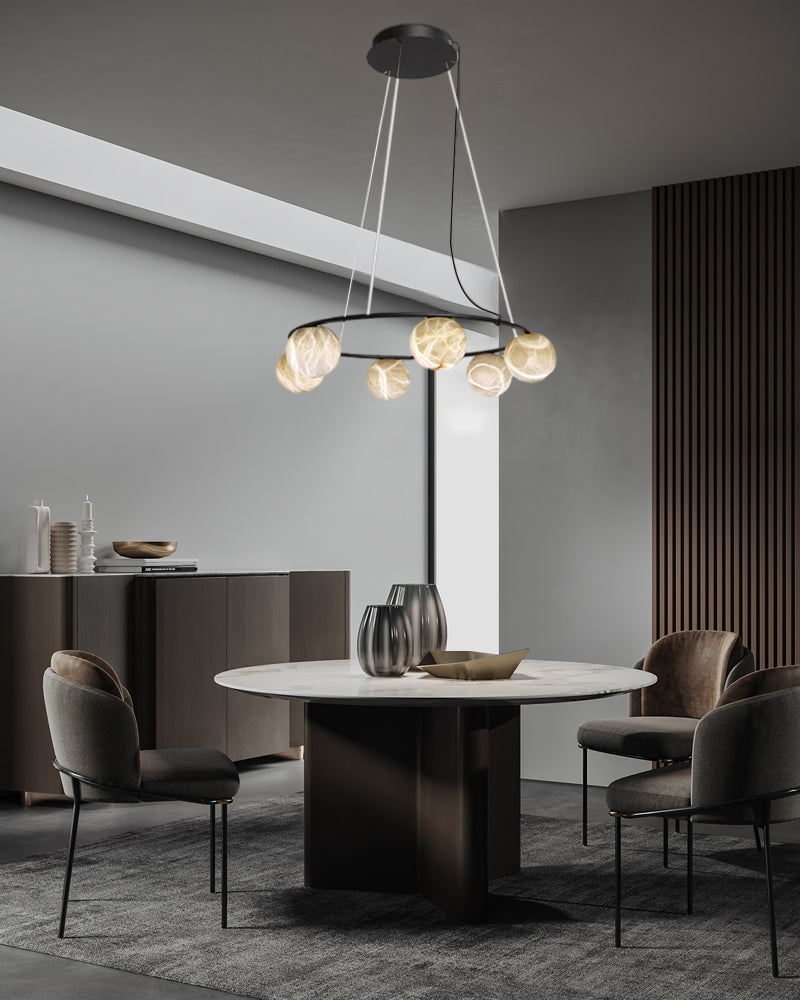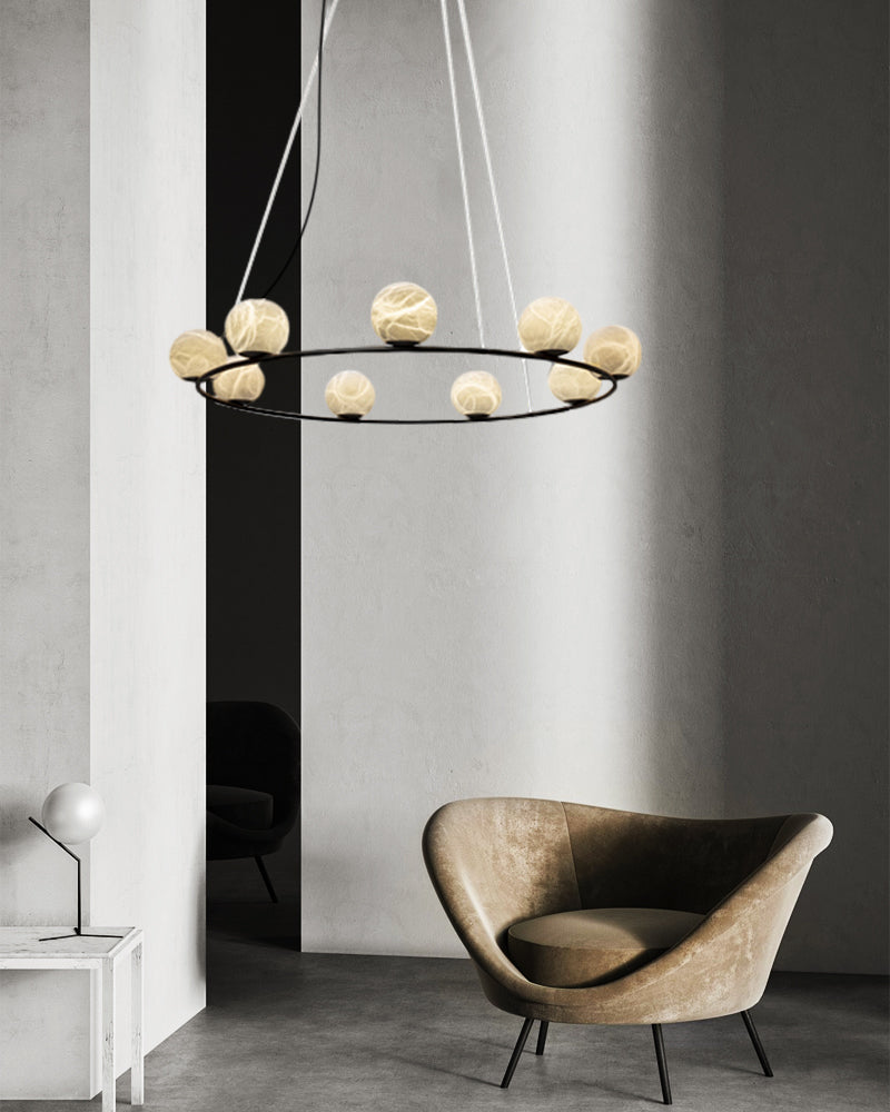 Illuminate your decor with the Chandelier, where antique black meets the celestial beauty of alabaster in a harmonious dance of luxury and sophistication. Carved from solid alabaster, its adjustable wires allow for custom compositions, enabling you to create a truly unique and captivating design.