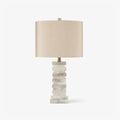 A study in mixed media, the ethereal Table Lamp is crafted of beige-flecked white alabaster, fabric finial, and gold metal neck. Its rectangular white cotton shade reflects the geometry of the base, which is especially beautiful when lit.
