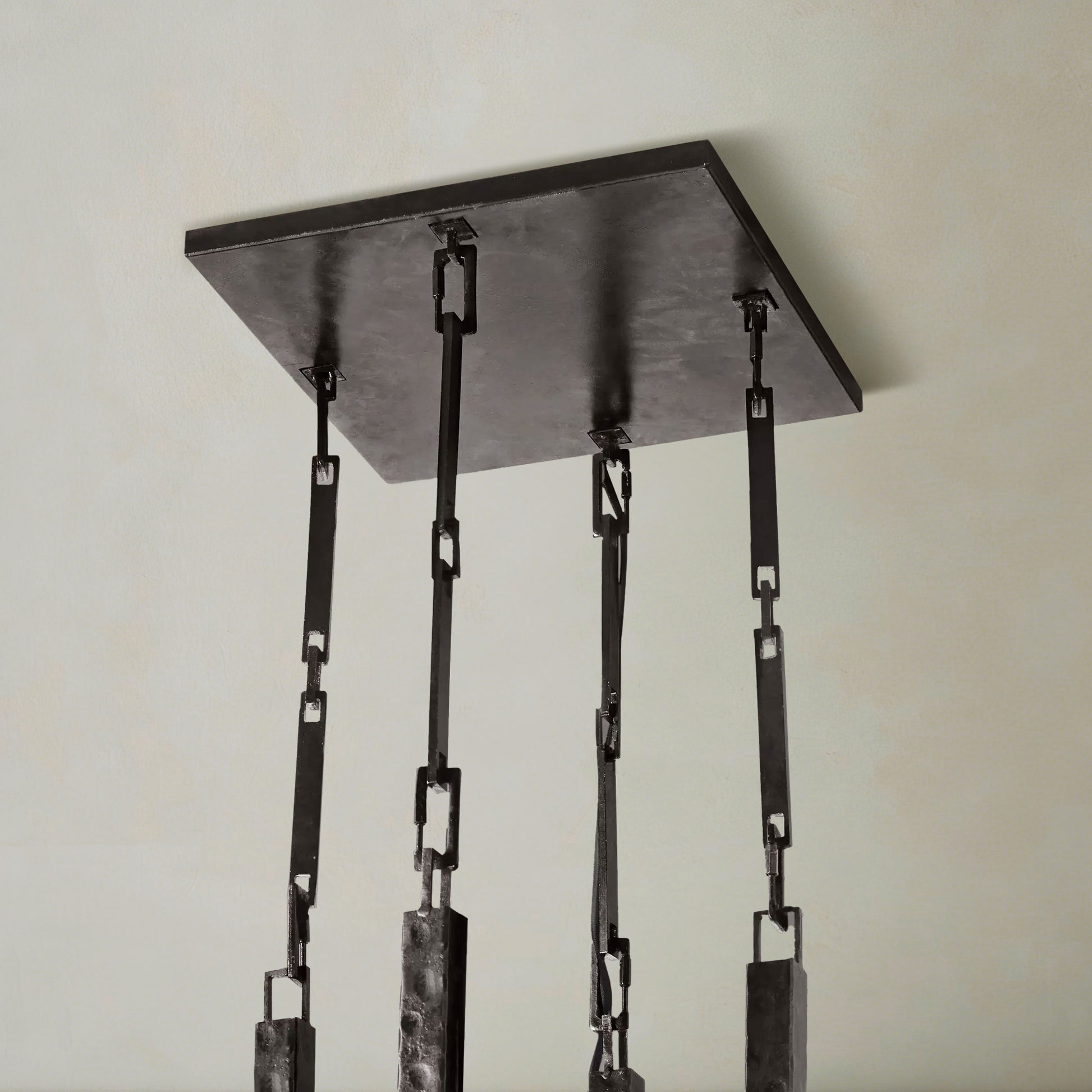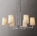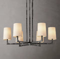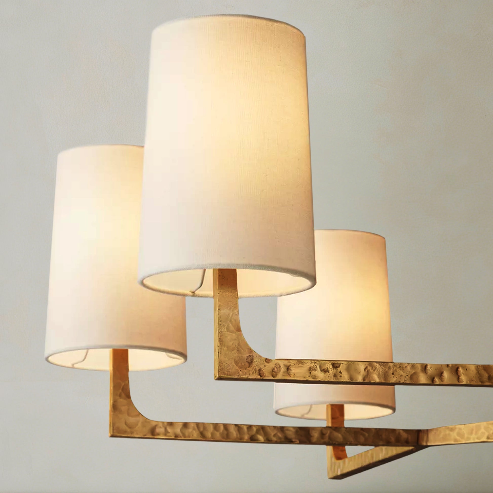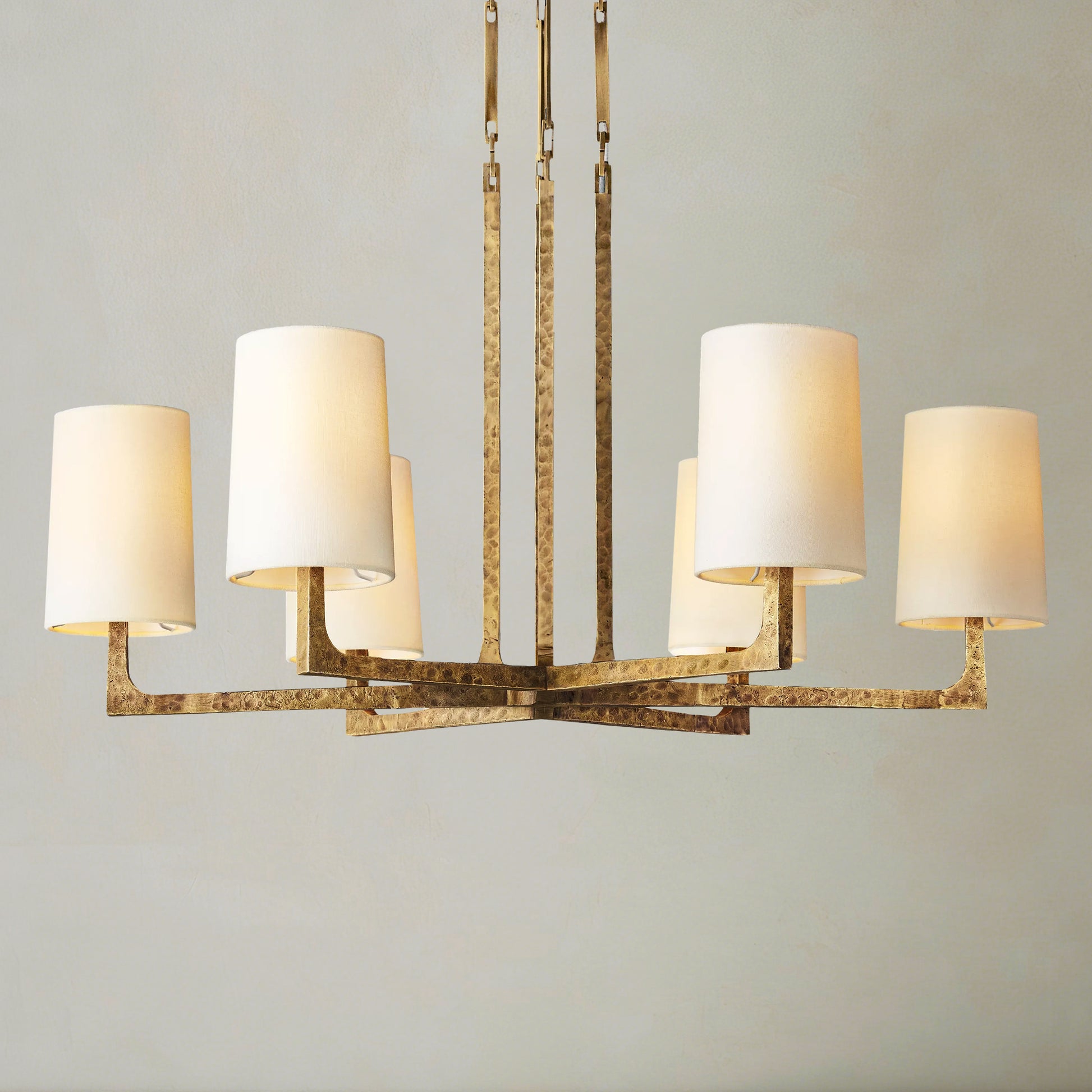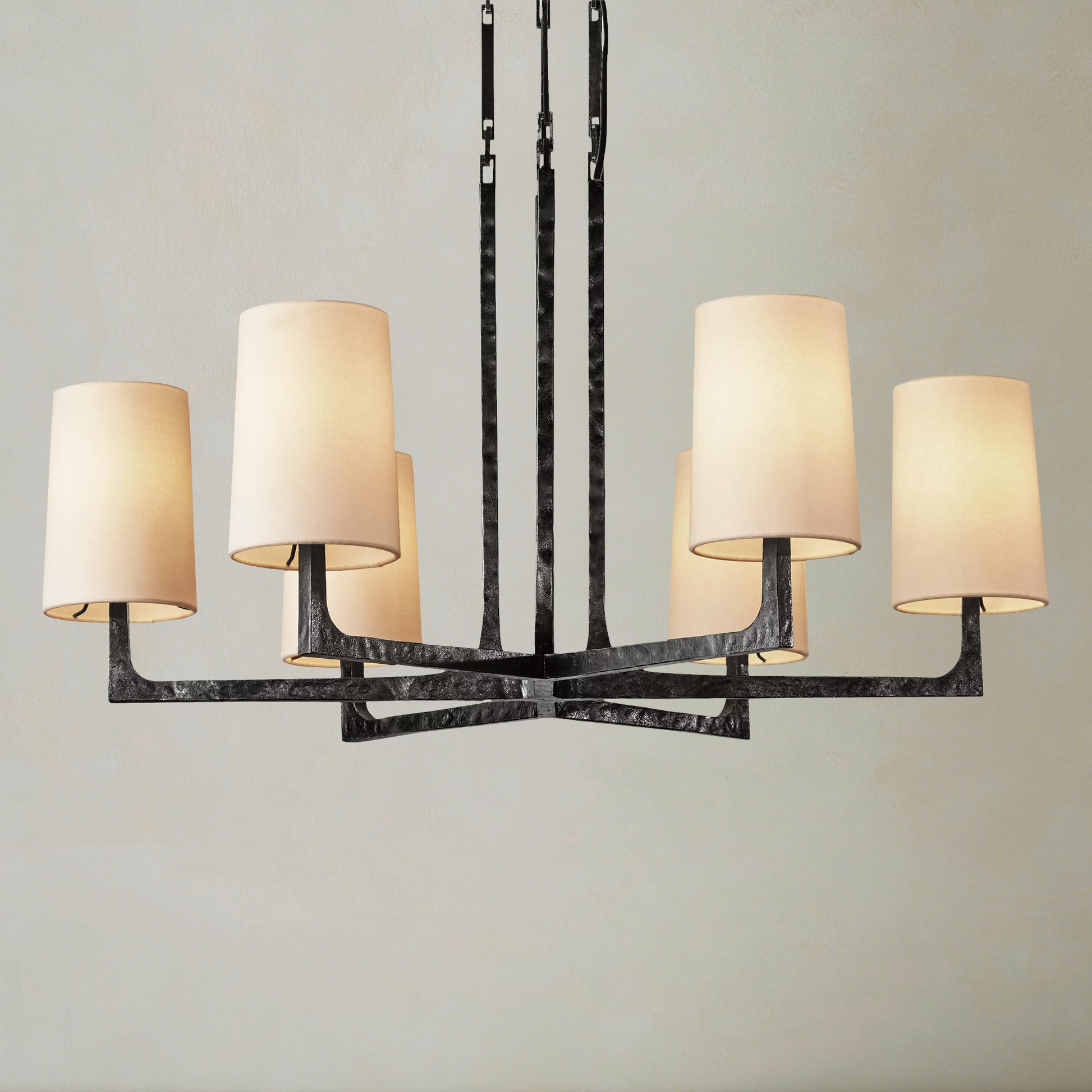 Simple and elegant, our Waring Round Chandelier 36" embodies the beauty of refined minimalism. A hand-forged hammered metal frame accentuates a meticulously tailored white linen shade. It masterfully balances form and proportion, weaving light and shadow while seamlessly blending sharp angles with subtle curves.