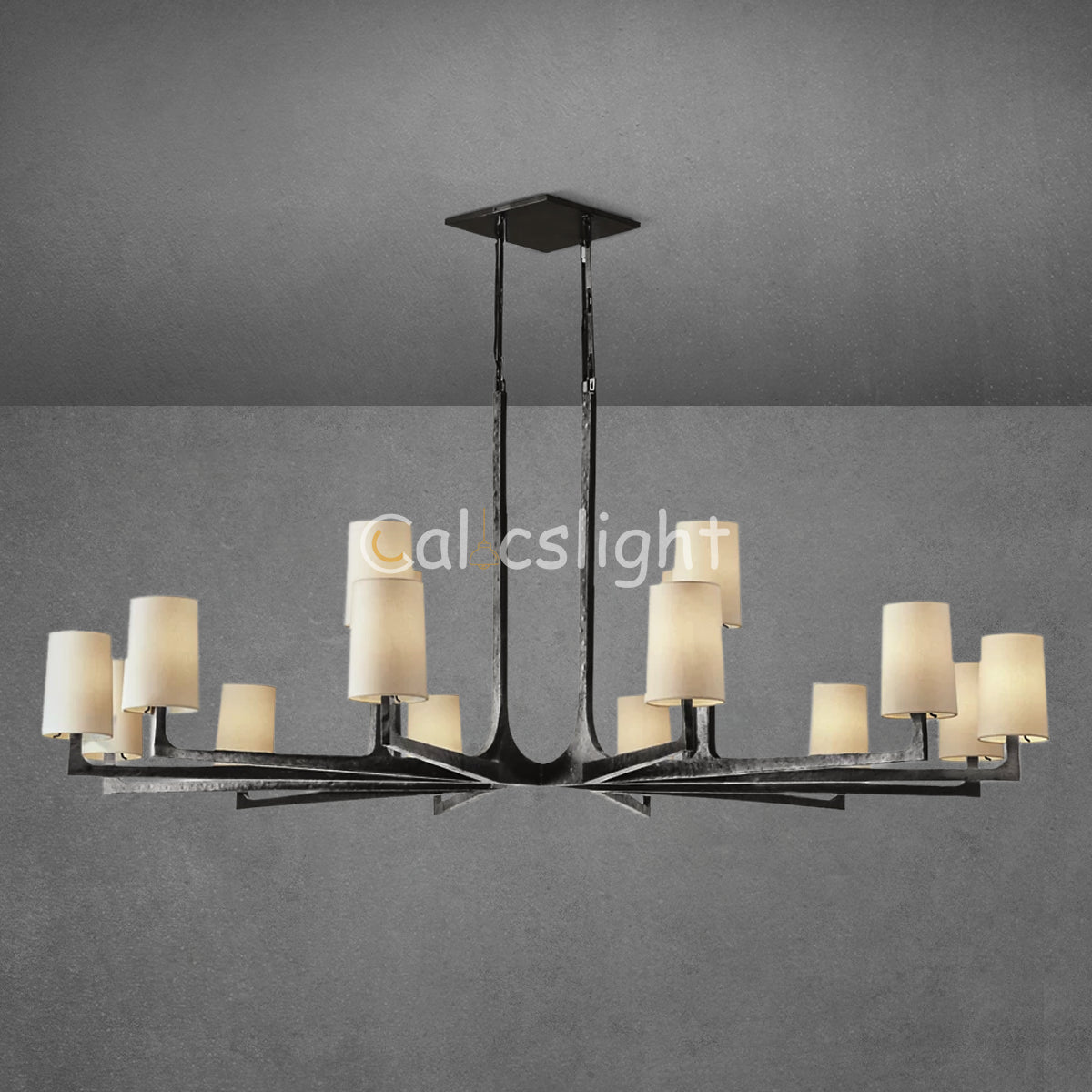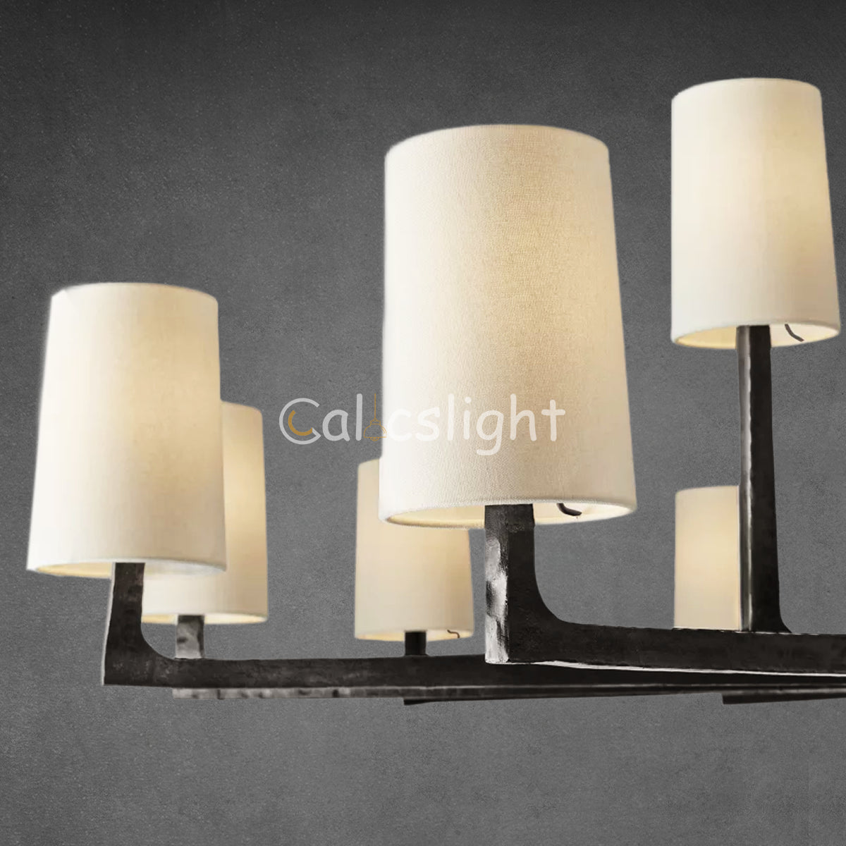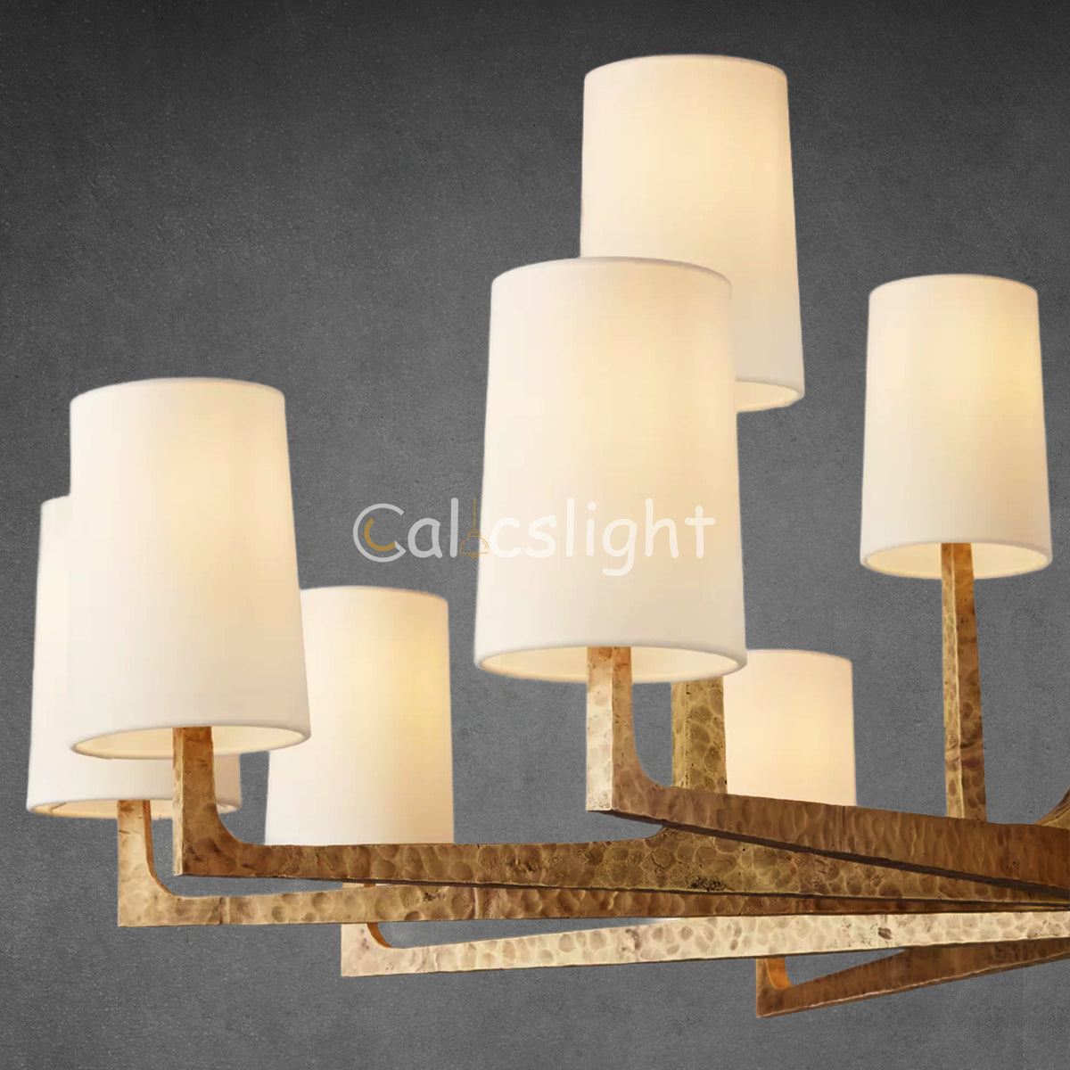 The hand-forged, hammered metal frame - with perfectly tapered arms - showcases a tailored white linen shade. In balance and proportion, it blends light and dark, crisp right angles and understated curves.